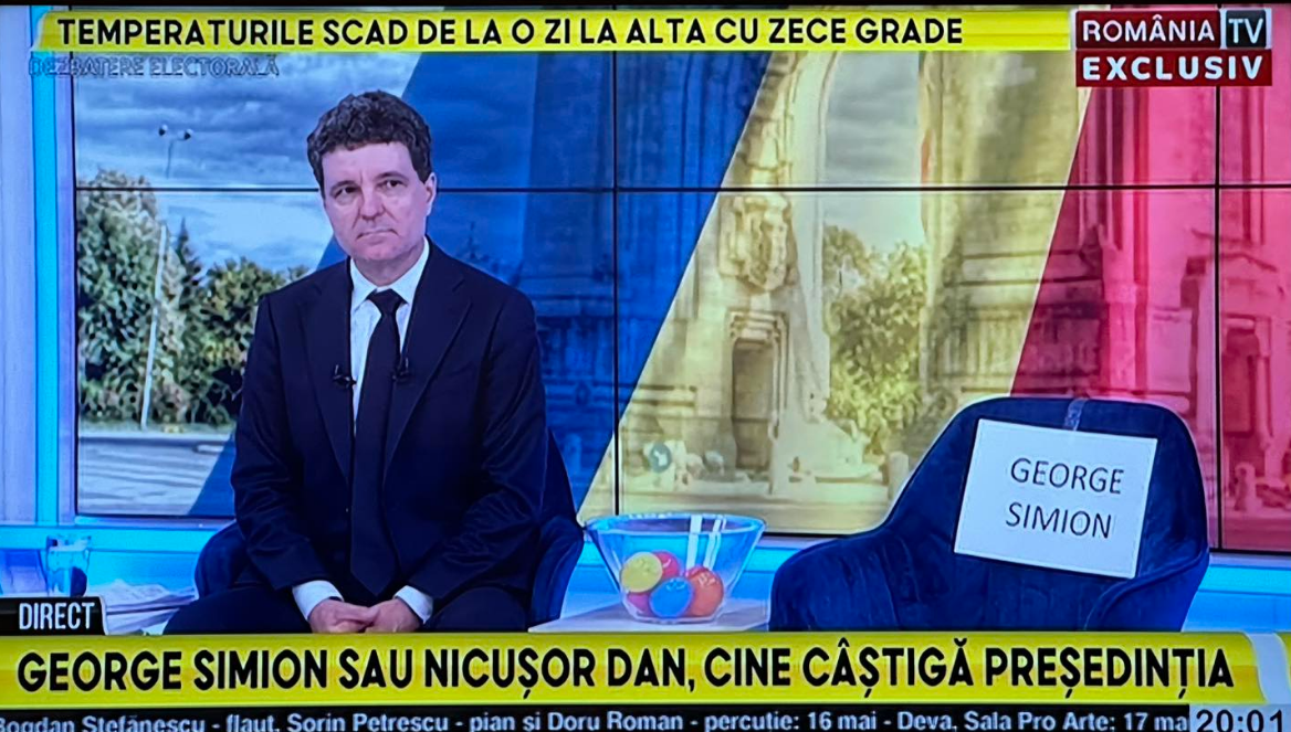 Și în această seară, liderul AUR, George Simion, lipsește de la o nouă confruntare electorală, cea organizată de România TV. În platou se află doar Nicușor Dan, iar alături de el, un scaun gol, pe care scrie numele contracandidatului său – George Simion. Imaginea este deja familiară, după ce Simion a absentat și de la celelalte mari dezbateri ale campaniei: la Digi24, dar și aseară, la Antena 3.