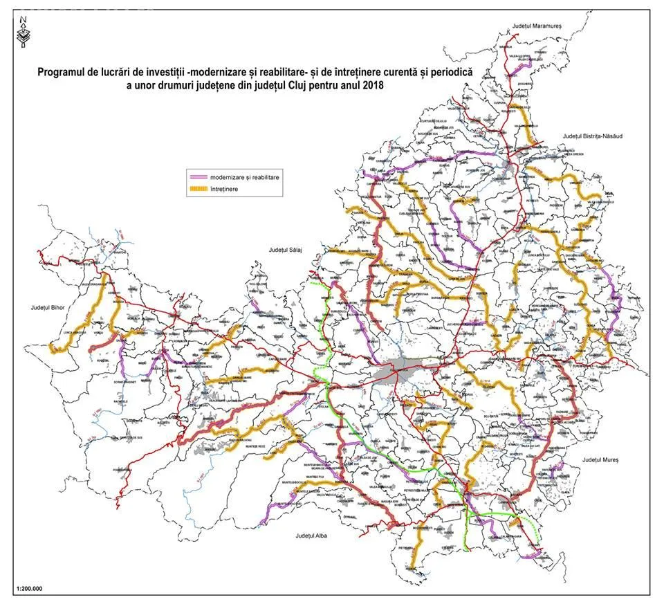 Consiliul Județean Cluj a publicat reprezentarea grafică a lucrărilor de reabilitare și modernizare, respectiv de întreținere curentă și periodică ce vor fi executate în anul 2018 pe nu mai puțin de 64 de drumuri județene.