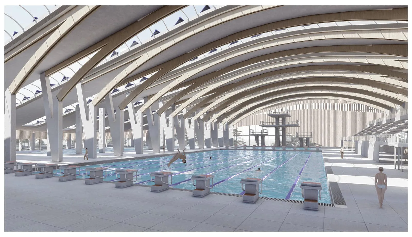 - Bazin de înot acoperit cu capacitate de 1000 spectatori, cu zone dedicate competițiilor sportive de natație ce includ: un bazin olimpic de înot, un bazin olimpic de sărituri, o zonă de gradene pentru spectatori, zone de agrement, un bazin de inițiere, saune, jacuzzi, vestiare