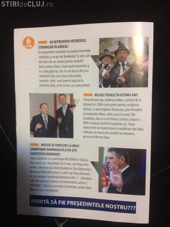 ”În mod evident, materialul primit de către clujeni în căsuţele poştale are un caracter mincinos, având în vedere că se fac declaraţii nefondate privind fapte viitoare ale candidatului. Susţinerile din textul fluturaşului distribuit nu fac obiectul programului candidatului Klaus Iohannis şi nici a acţiunilor electorale desfăşurate de către acesta.