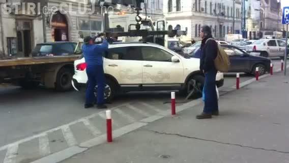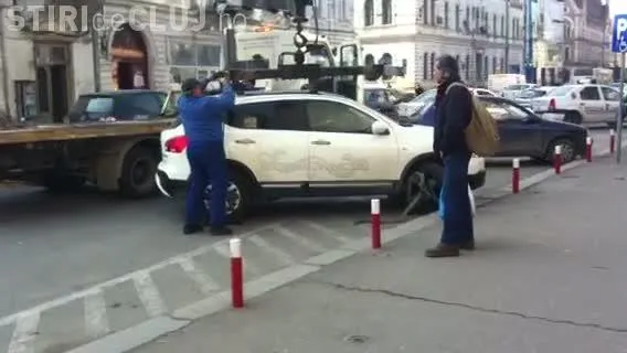 Politistii locali din Cluj-Napoca s-au pus pe ridicat masini. "Ghinionul" a cazut pe un Jeep parcat neregulamentar in fata magazinului Central.