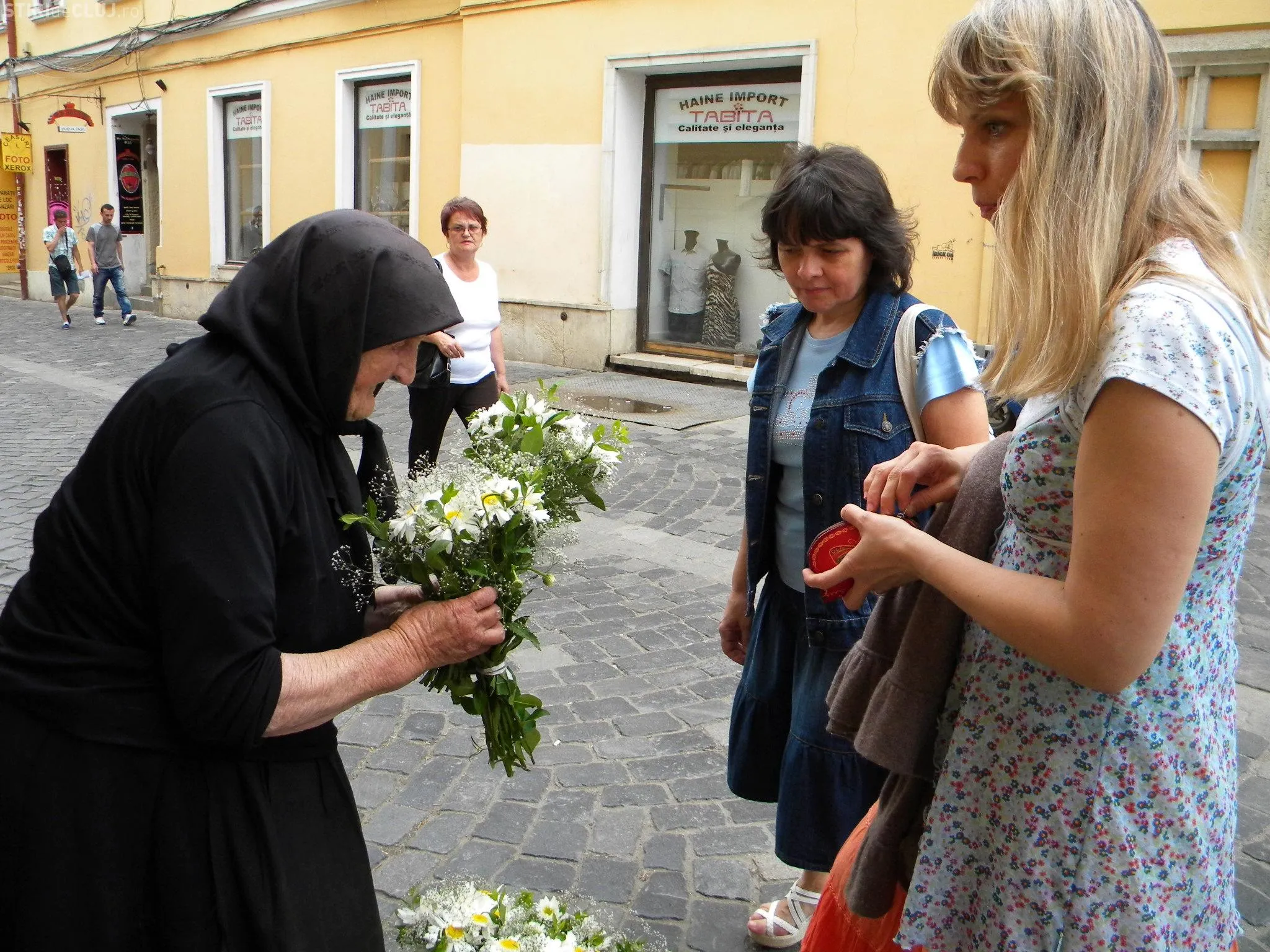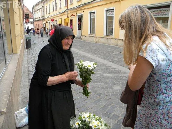 Maria Rusu vine buchete de flori pe strada pietonala "când-cum", pentru a face un ban. La cei 92 de ani pe care îi are spune că nu mai este în stare din punct de vedere fizic să mai facă vreo activitate fizică, adică să aibă un loc de muncă.