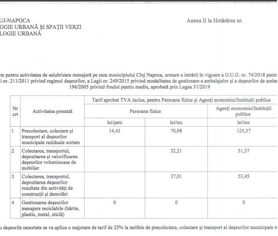 Primăria Cluj-Napoca vrea să majoreze tarifele de salubrizare menajeră achitate de populație de la 10,92 lei de persoană la 14,43 lei de persoană. Ultima scumpire a deșeurilor a avut loc în 2019.