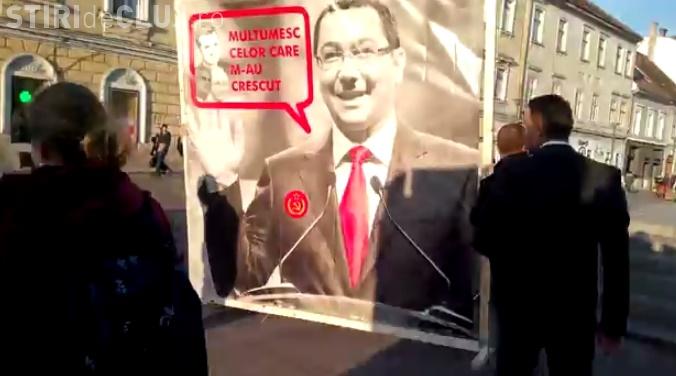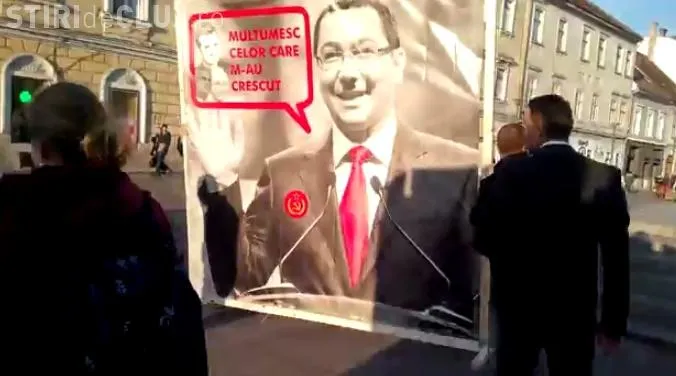 Liberalii s-au plimbat prin centrul Clujului cu un banner cu Victor Ponta având desenată pe față o mustață ca cea a lui Hitler, alături de un alt banner cu imaginea lui Nicolae Ceaușescu.