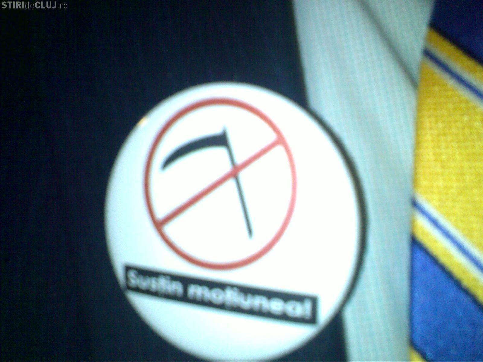 Motiunea de cenzura este initiata de PNL, PSD si PC si va fi supusa la vot in 27 octombrie. Coasa de pe insigna are mai multe semnificatii: este unealta preferata a premierului Emil Boc si cea cu care a taiat pensiile si salariile bugetarilor.
