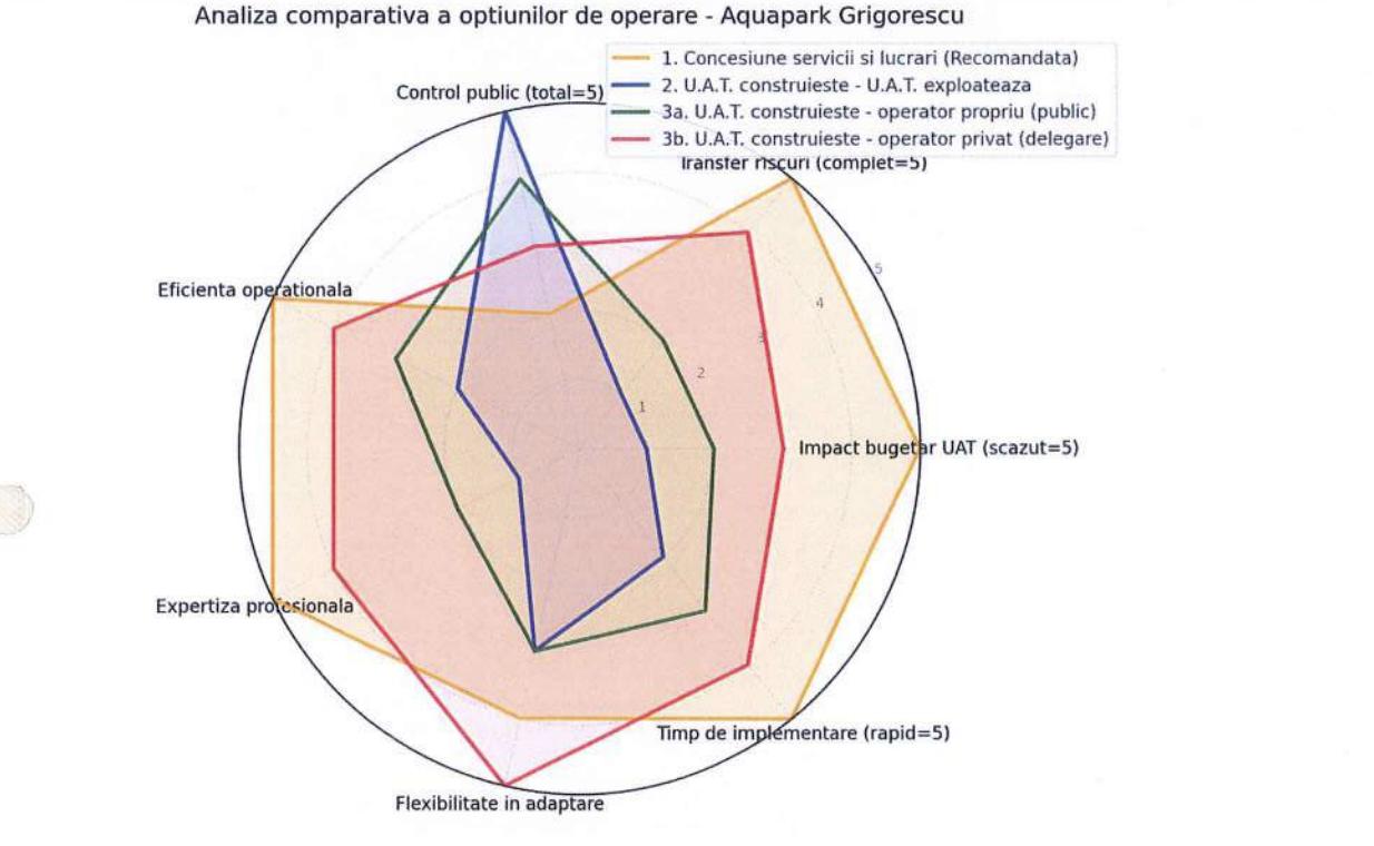 Specialiștii au propus ca soluție concesionarea lucrărilor și serviciilor către un operator privat. Probabil, această variantă putea să fie depistată încă din etapa de redactare a documentului. De altfel, Primăria Cluj-Napoca și-a exprimat dorința ca viitorul Aquapark să fie administrat de o firmă privată.