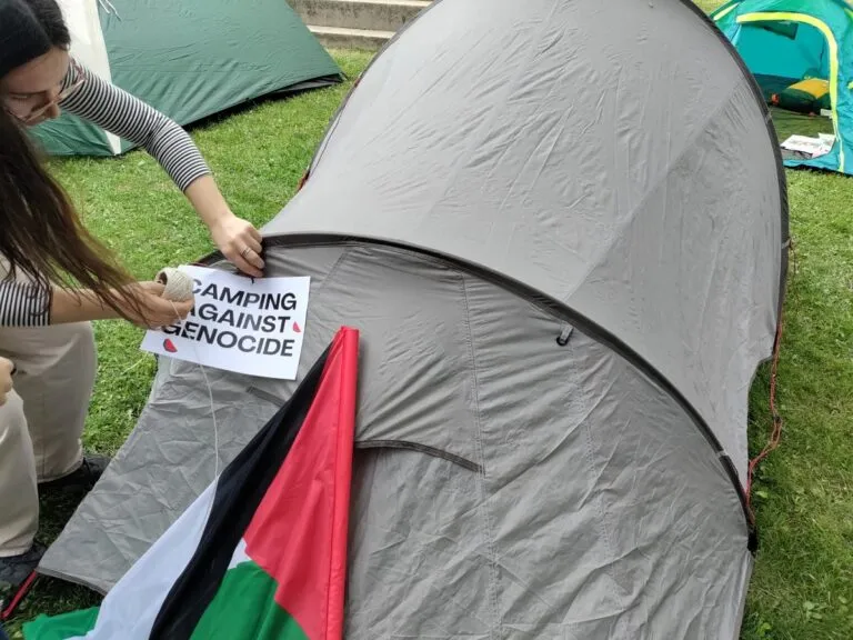 „În după-amiaza zilei de 24 mai, un grup de studenți ai Universității Babeș-Bolyai (UBB) și ai Universității Tehnice din Cluj-Napoca (UTCN), reuniți sub numele de Studenți clujeni pentru Palestina/Cluj Students for Palestine, au ocupat curtea Facultății de Sociologie și Asistență Socială și au organizat o tabără pentru o perioadă nelimitată în solidaritate cu poporul palestinian. Studenții solicită celor două universități, și nu numai, responsabilitate instituțională și dezinvestire imediată față de orice entitate implicată în sau care profită de pe urma genocidului în desfășurare în Fâșia Gaza”, se arată într-un comunicat de presă transmis de organizație.