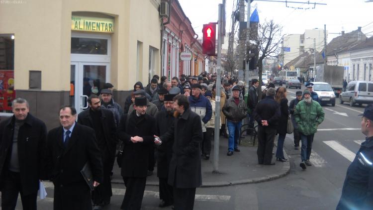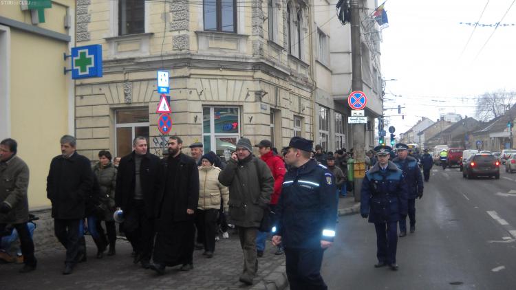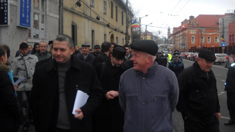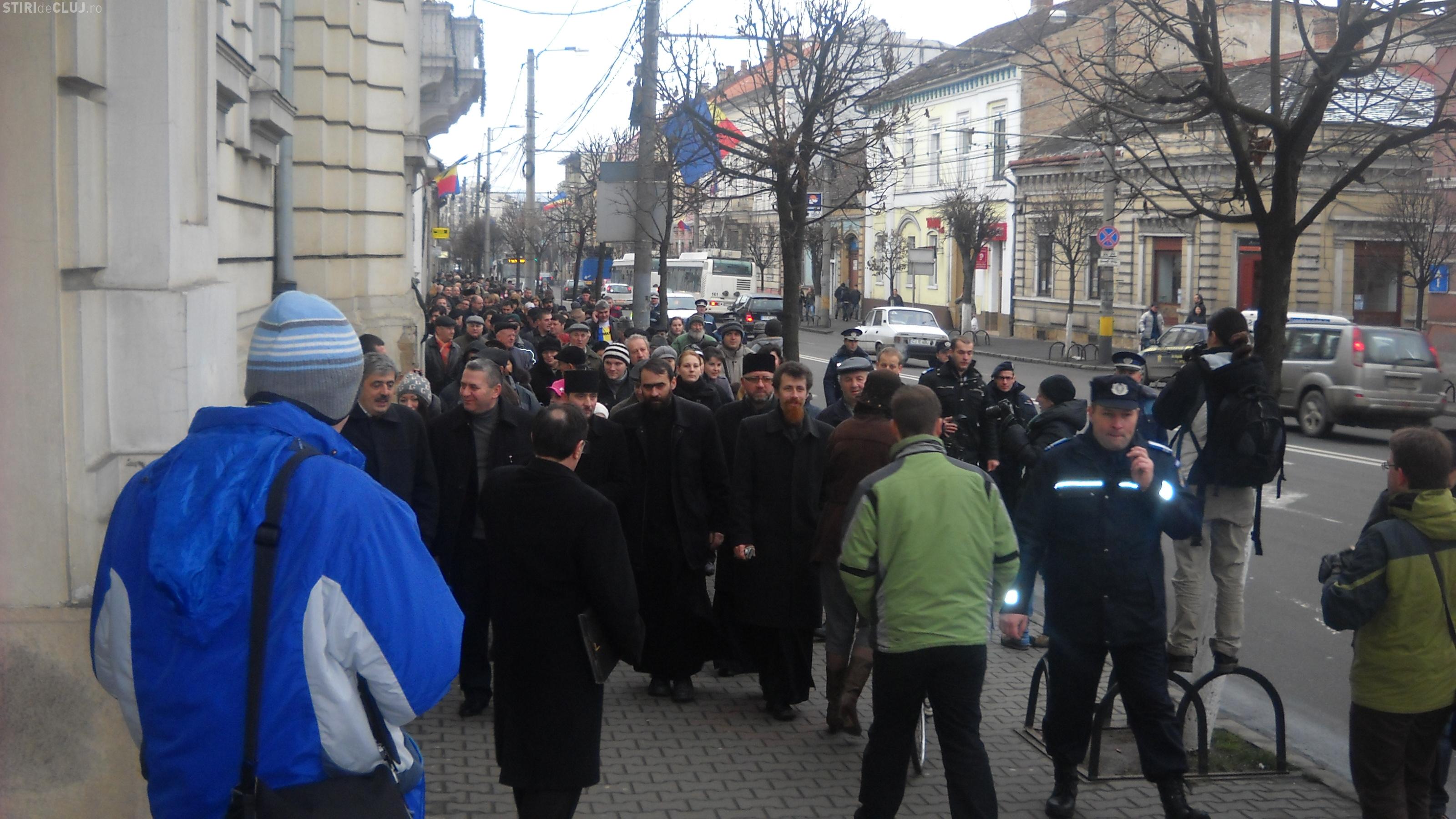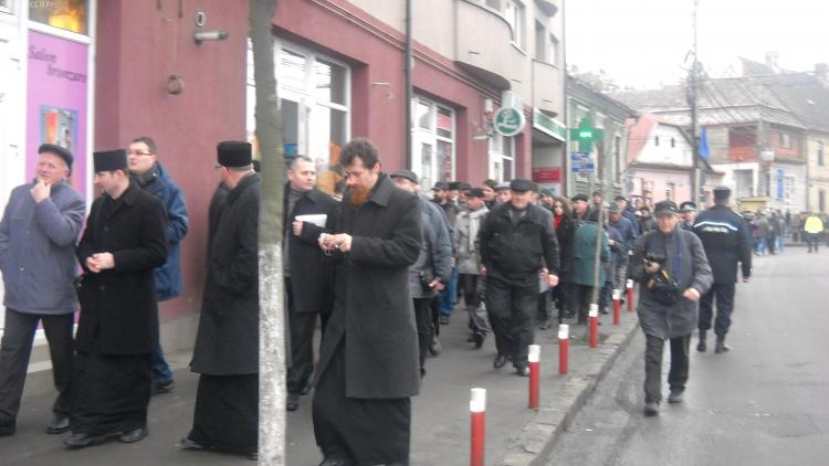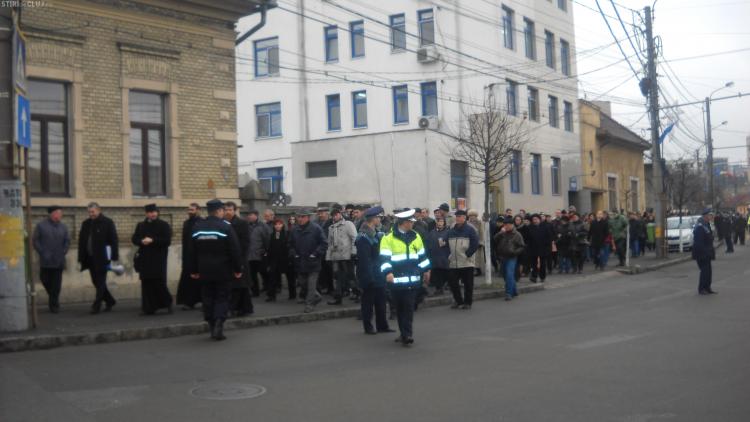 La protest au luat parte si deputatii Mircea Giurgiu si Horea Uioreanu, marsul incepand la ora 12.00 din zona cimitirului si a continuat pe Calea Manastur, strada Motilor, cu oprire la Primaria Cluj-Napoca si apoi grupul a ajuns la Prefectura Cluj. Inainte de a porni spre centrul orasului, protestatarii impreuna cu preotii au spus rugaciunea Tatal Nostru.