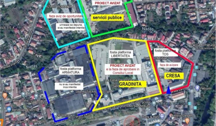 În zona fostelor platforme Libertatea și Mucart avem următoarele dotări realizate de investitorii privați. Un spațiu rezervat pentru dotare publică pe 500 de mp utili. Acolo vom vedea dacă va trebui să mai facem o creșă, grădiniță sau școală. Aceasta va fi donat Primăriei. O grădiniță privată va exista acolo și două parcuri de 2.000 și altul de 4.400 mp, lângă pârâul Nadăș.