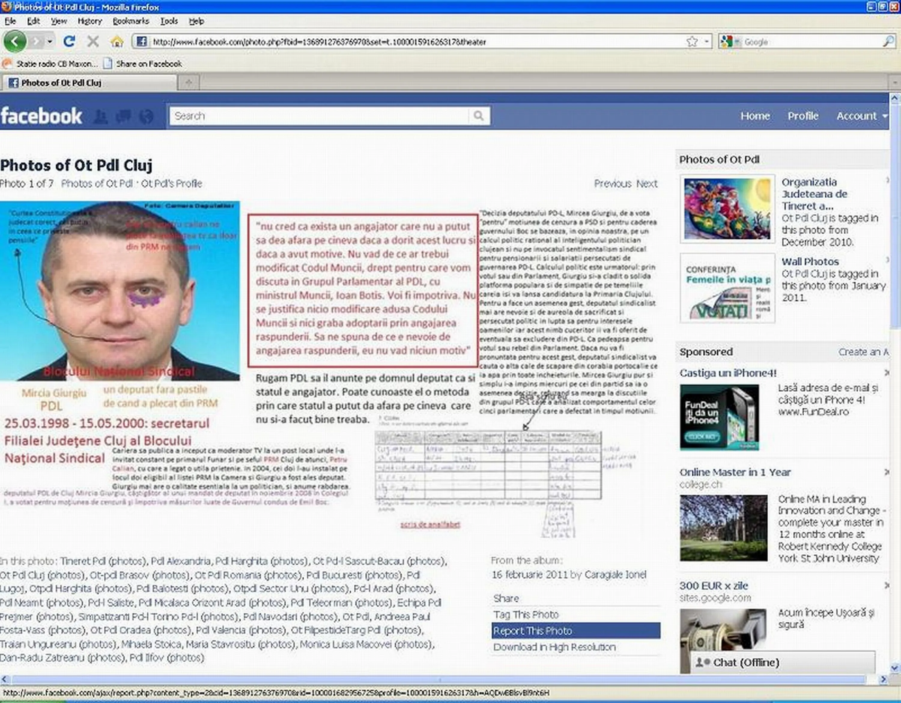 Deputatul PDL Mircia Giurgiu a fost atacat pe pagina de Facebook a organizatiei de tineret a PDL Cluj, fiind prezentat cu un ochi vanat, iar sub fotografia trucata scrie Blocul National Sindical.