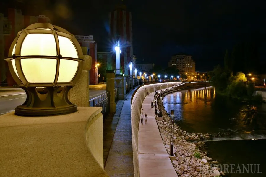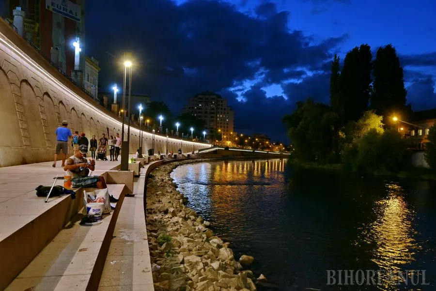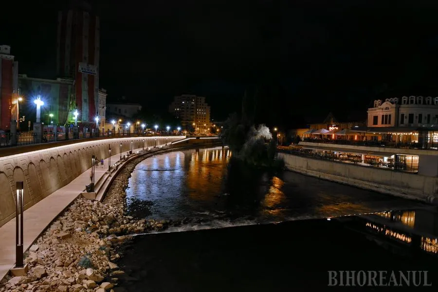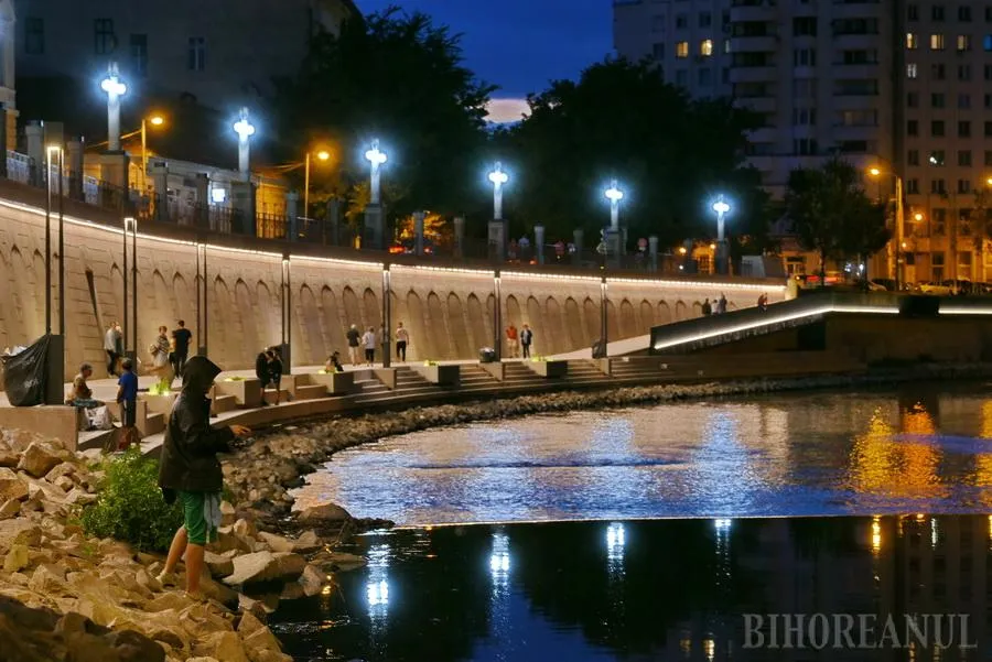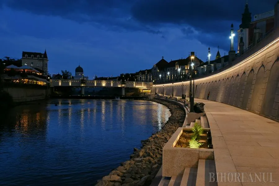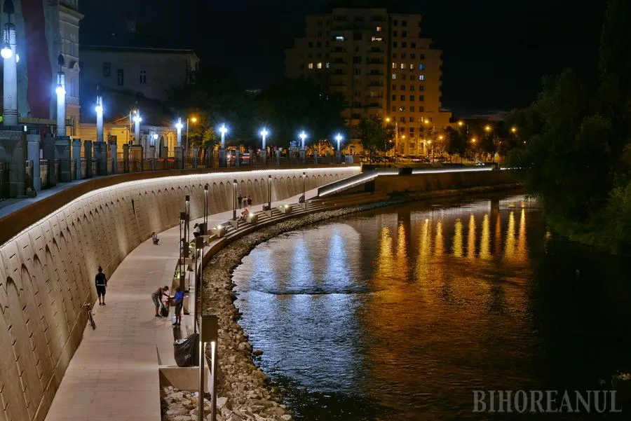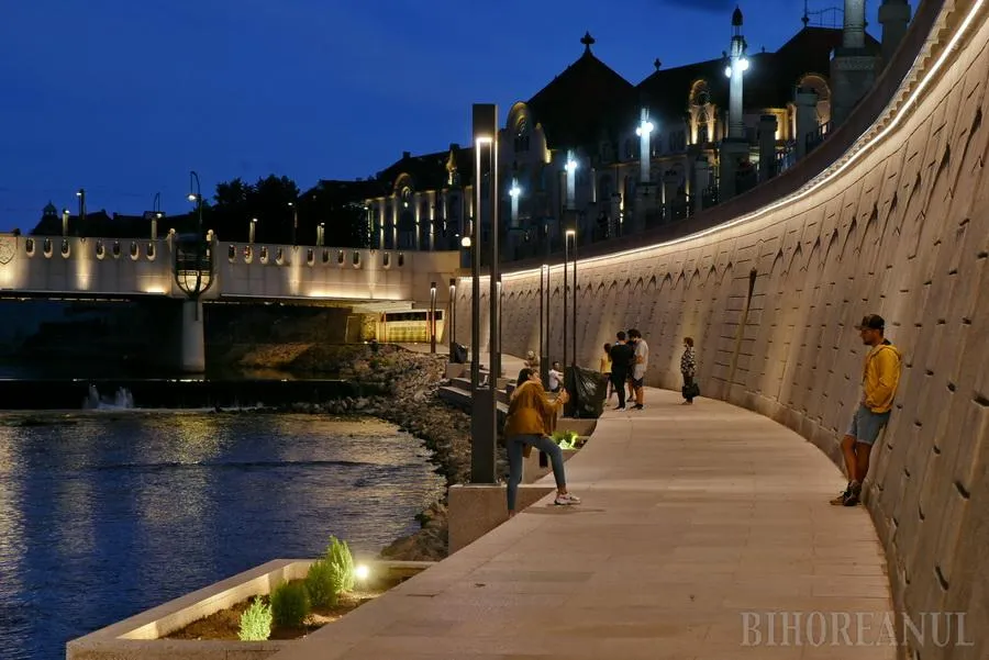 Promenada de pe malul stâng al Crişului Repede, de lângă Primăria Oradea, este cel mai nou punct de atracţie din oraş, după ce marţi seara a pornit iluminatul arhitectural.