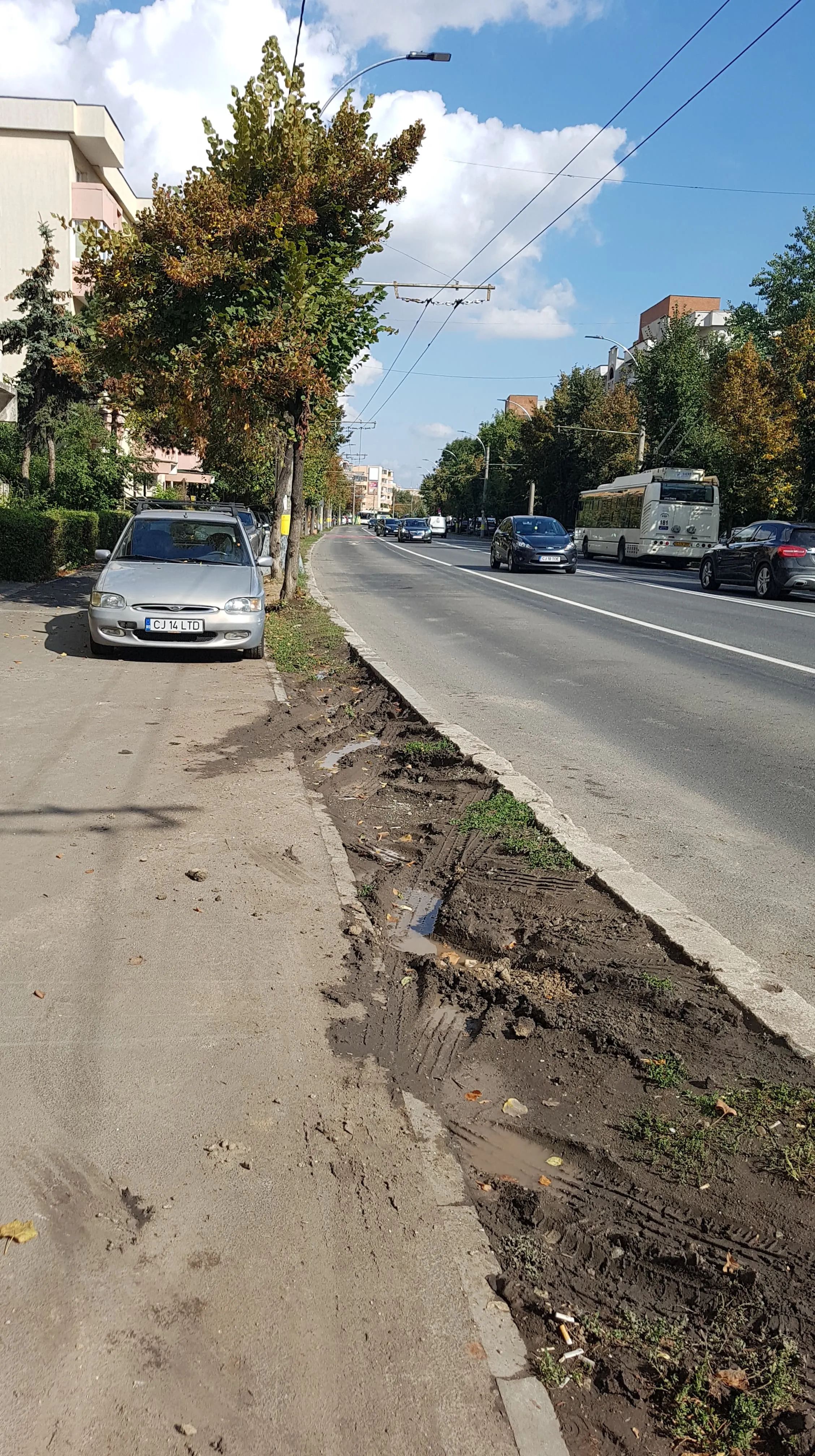 ”Dupa cum bine stiti, Primaria Cluj-Napoca a reabilitat bulevardul Titulescu in primavara/vara acestui an, eliberand benzile ocupate de masini parcate si astfel creand in total 4 benzi (din care unul dedicat transportului in comun). Problema care a aparut e ca masinile care au parcat pe marginea drumului au ajuns pe trotuare, injumatatind astfel spatiul destinat pietonilor. Cu primele ploi masinile care au urcat pe trotuar au distrus si spatiul verde aducand noroi pe trotuar. O alta problema mai e lipsa de vizibilitate la iesirile de pe aleele dintre blocuri, cu risc de accidente.
