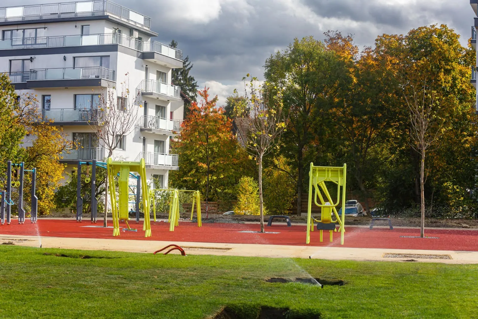 Aleile sunt amenajate din materiale permeabile (care lasă apa să pătrundă în sol) pentru un impact minim asupra mediului. Va exista o zonă cu fântâni pavimentale, loc de joacă cu dotări moderne pentru copii, zonă de recreere pentru seniori unde vor fi instalate mese de șah, zonă de fitness, zone de promenadă și piste pentru biciclete.