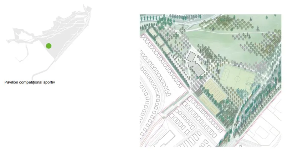 ”Parcul Est va avea o zonă sportivă cu o serie de dotări complementare – pavilion sportiv competițional cu sală de sport cât și diverse terenuri exterioare – cu zgură, un teren de fotbal neîngrădit, trei terenuri exterioare de baschet, dar și zone naturale îngradite cu vegetație unde se pot organiza activități sportive. Vor fi și circuite de piste de alergare (5-10 kilometri), o pistă finlandeză din scoarță de copac de 1 kilometru tot pentru alegat, conexiuni pentru biciclete de 8 kilometri, legate de scara orașului, un circuit accidentat pentru biciclete, 4 zona de fitness și gimnastică”, a declarat arhitectul Silviu Aldea