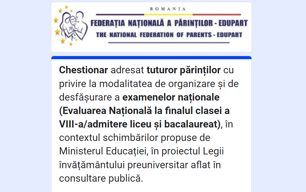 Sunt discuţii aprinse pe grupurile de părinţi despre schimbările din noua lege a Educaţiei. Un chestionar al Federaţiei Naţionale a Părinţilor a fost completat deja de peste 50.000 de adulți. Cel mai dezbătut subiect este examenul de admitere la liceu versus Evaluarea Naţională.