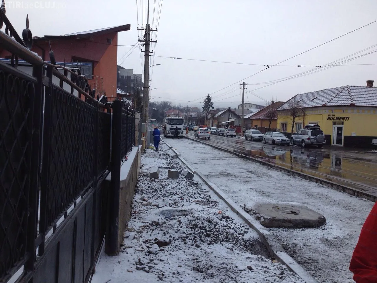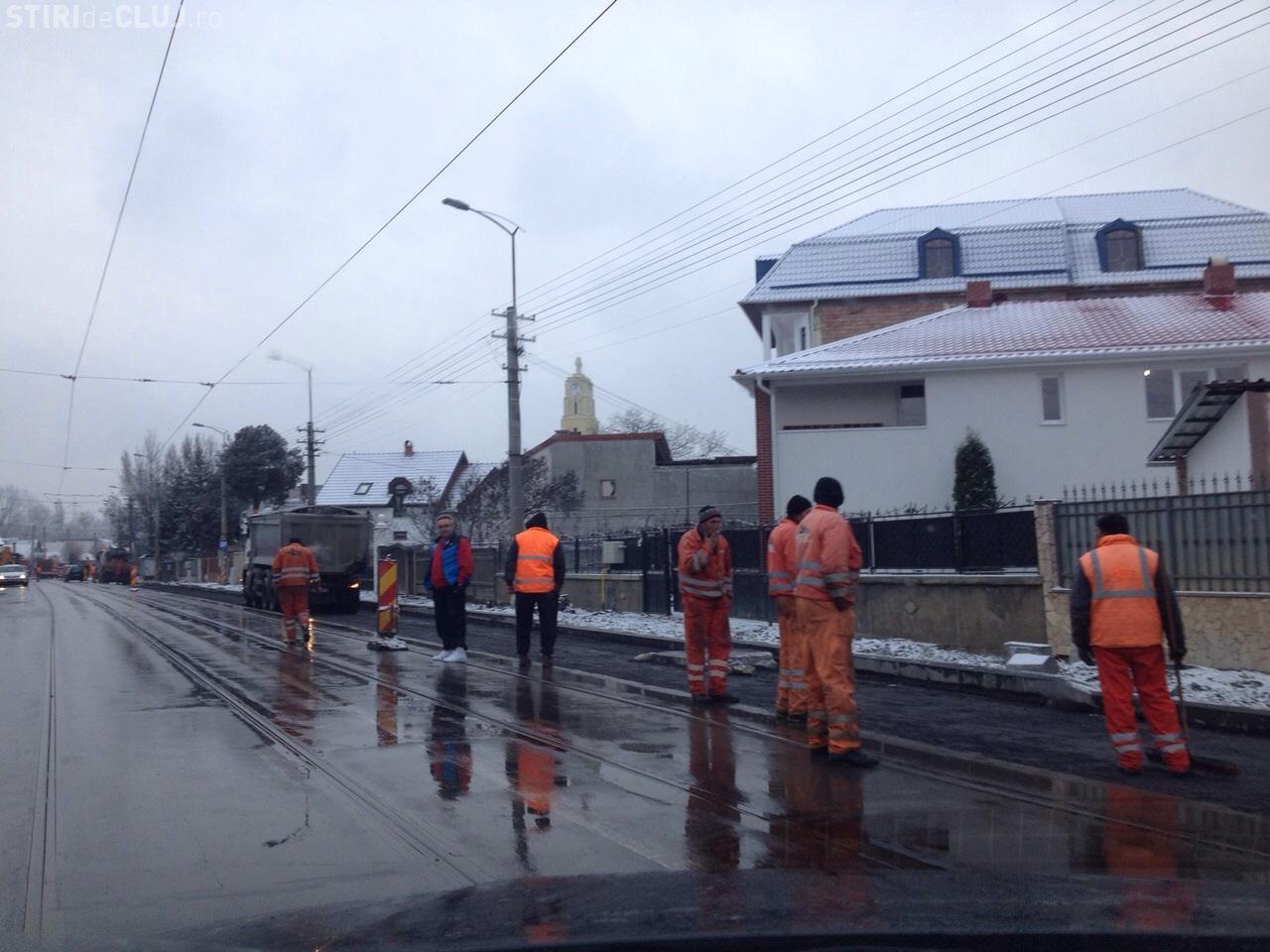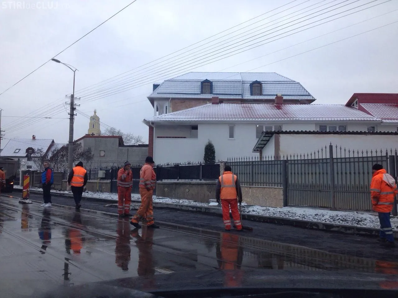 Muncitorii asfaltau vineri, 28 noiembrie, strada Oașului, direct peste stratul de zăpadă depus în urma ninsorii.