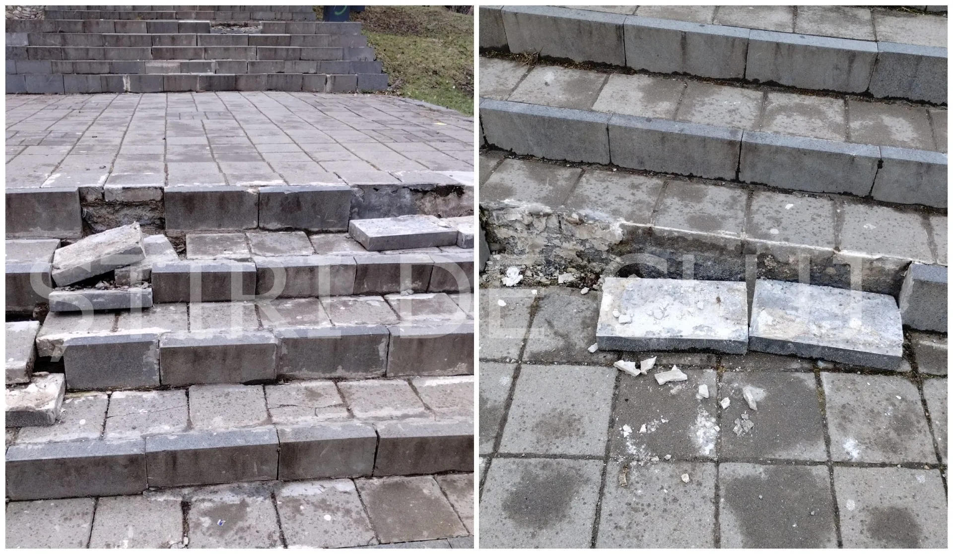 Din imaginile surprinse la fața locului se poate observa că mai multe porțiuni de pavaj sunt dislocate, iar treptele prezintă fisuri și denivelări.