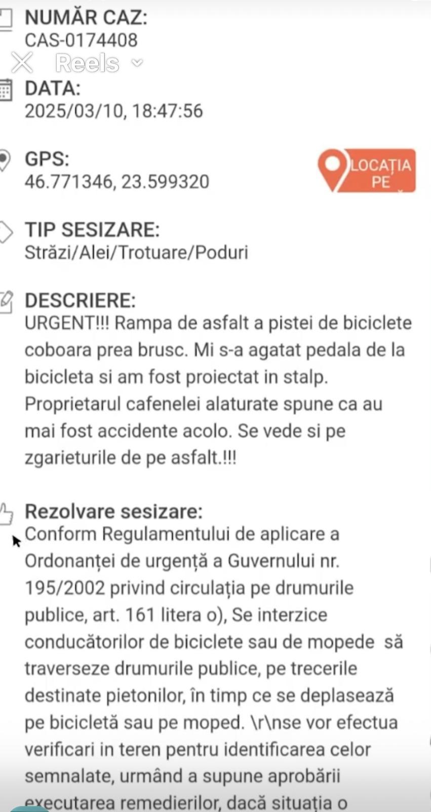 Clujeanul a explicat că a depus și o sesizare pe MyCluj, însă reprezentanții Primăriei i-au invocat că nu ar fi trebuit să fie pe bicicletă, în preajma unei treceri de pietoni.