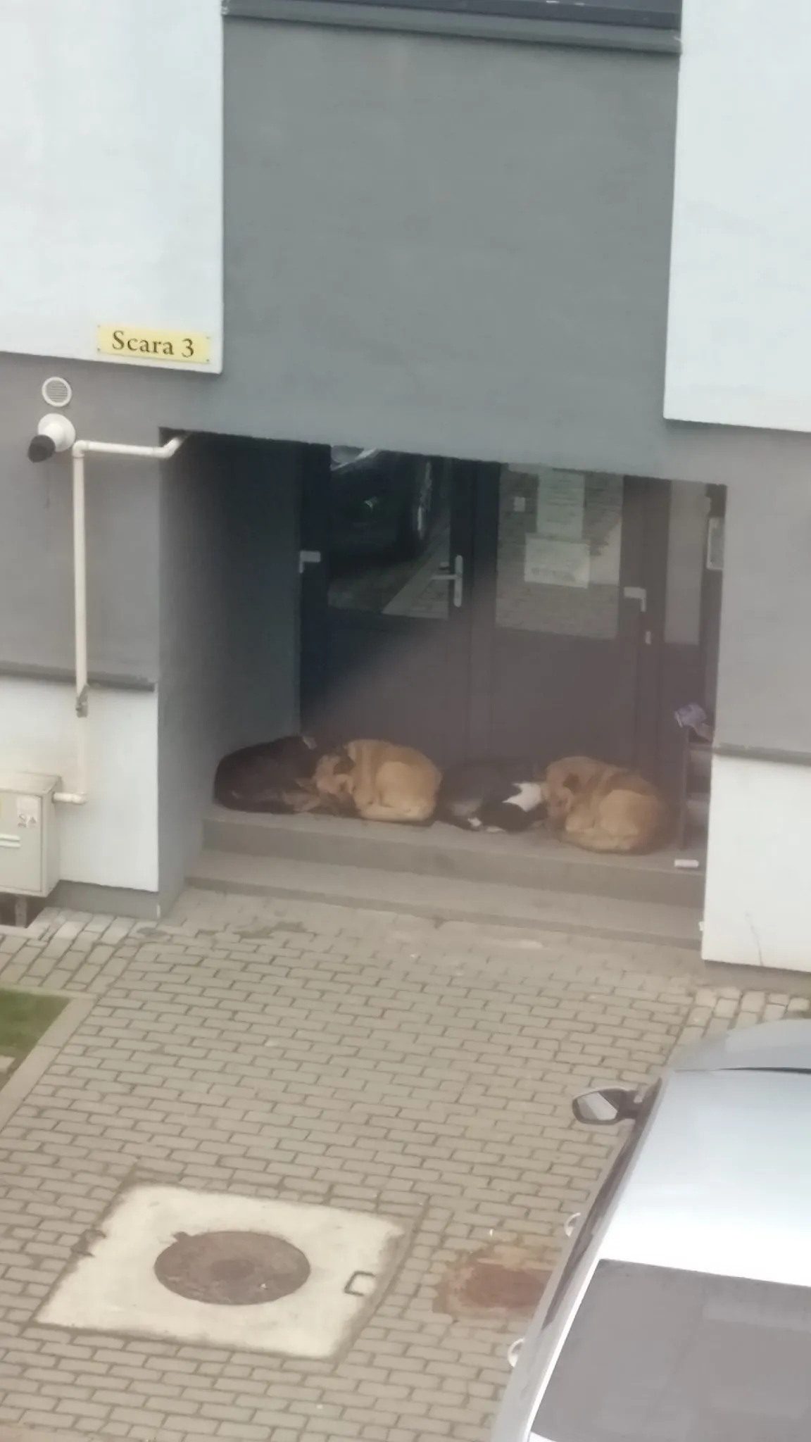 Vineri dimineața, mai mulți floreșteni au semnalat faptul că mai mulți câini vagabonzi blocat ieșirea dintr-un bloc. Animalele erau culcate pe treapta din fața scării.