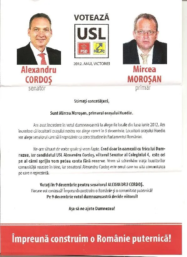 Primarul din Huedin, Mircea Moroșan, a făcut plângere la poliție împotriva USL pe motiv că a distribuit afișe și scrisori falsificate prin care se spunea că primarul îl susține pe candidatul USL la Senat, Alexandru Cordoș.