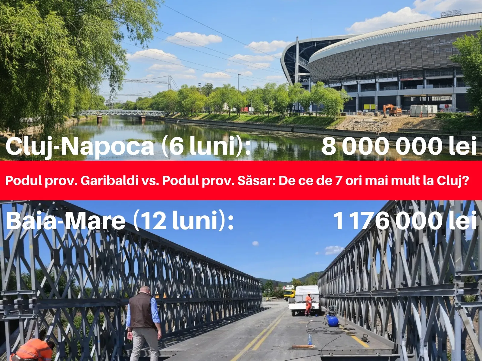 Administrația PNL ne cere să închidem ochii la un cost de 8.000.000 de lei pentru 6 luni, pentru un pod temporar. Pentru a înțelege dimensiunea acestei sume, am făcut o comparație simplă cu un proiect similar din Baia Mare realizat de CNAIR: Podul provizoriu de pe Săsar.