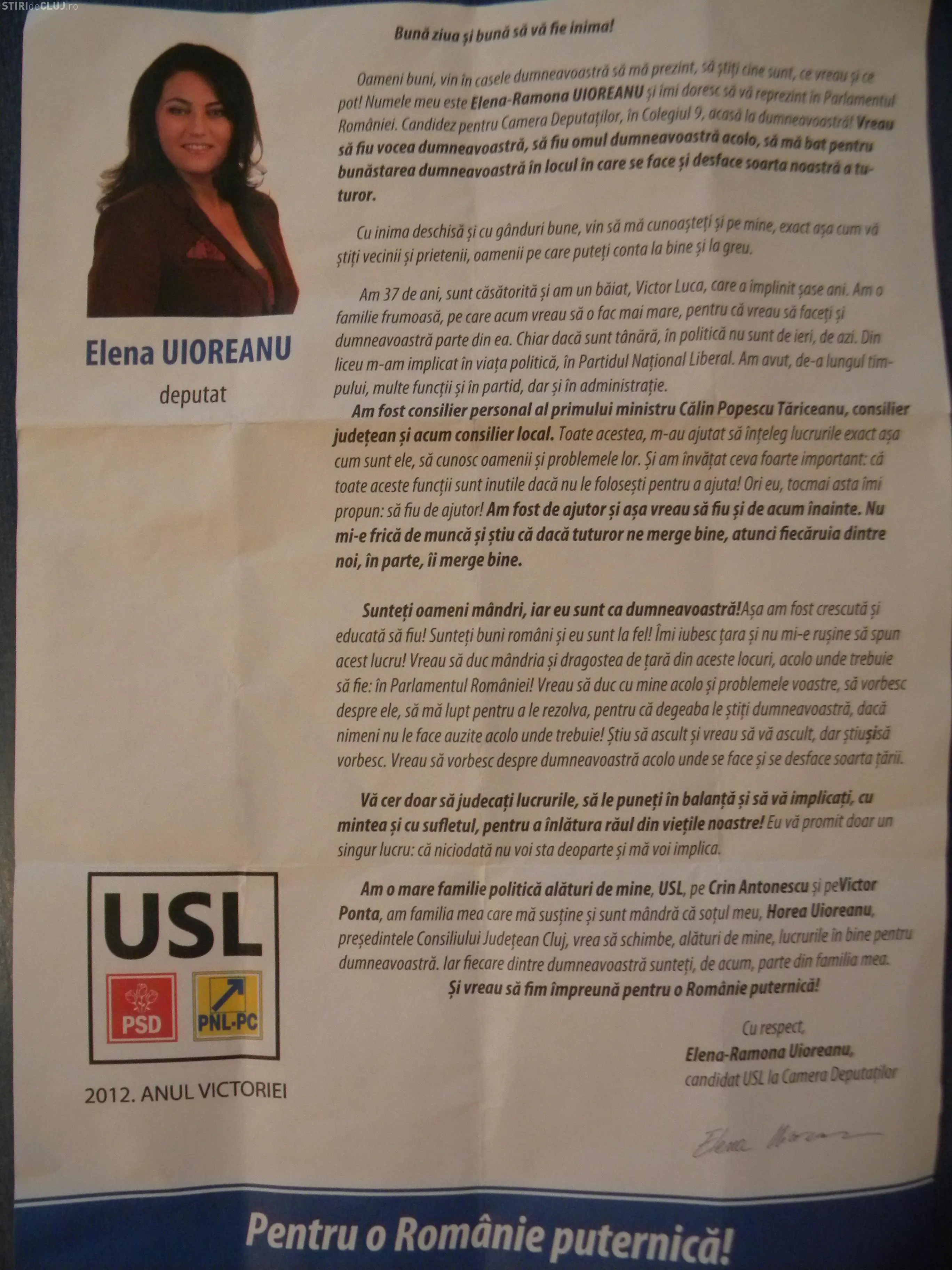 În materialele distribuite, candidata USL nu uită să precizeze cine este soţul ei şi cine îi oferă susţinerea. ”Am familia mea care mă susţine şi sunt mândră că soţul meu, Horea Uioreanu, preşedintele Consiliului Judeţean Cluj, vrea să schimbe, alături de mine, lucrurile în bine pentru dumneavoastră”, scrie Elena, într-una din scrisorile împărţite în localităţile mai sus menţionate.