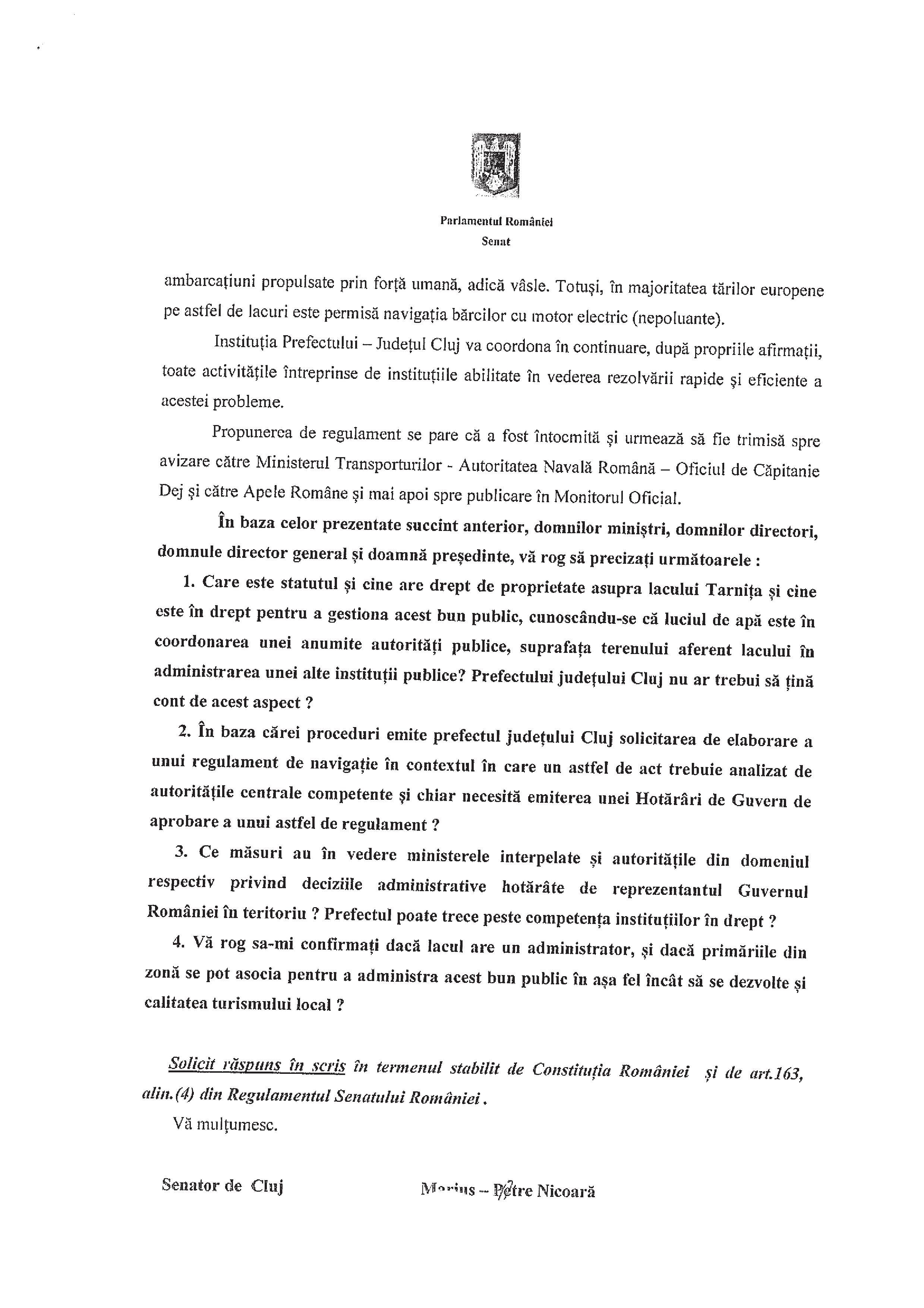 În plus, senatorul ALDE, Marius Nicoară, a făcut chiar o interpelare în Parlament prin care îl atacă pe prefectul Clujului, Aurel Cherecheș, pentru că și-a permis să ceară Hidroelectrica să facă acest regulament de navigație. Marius Nicoară are cabană pe malul lacului Beliș și este direct afectat de ”valurile” pe care Prefectura le face în zonă.