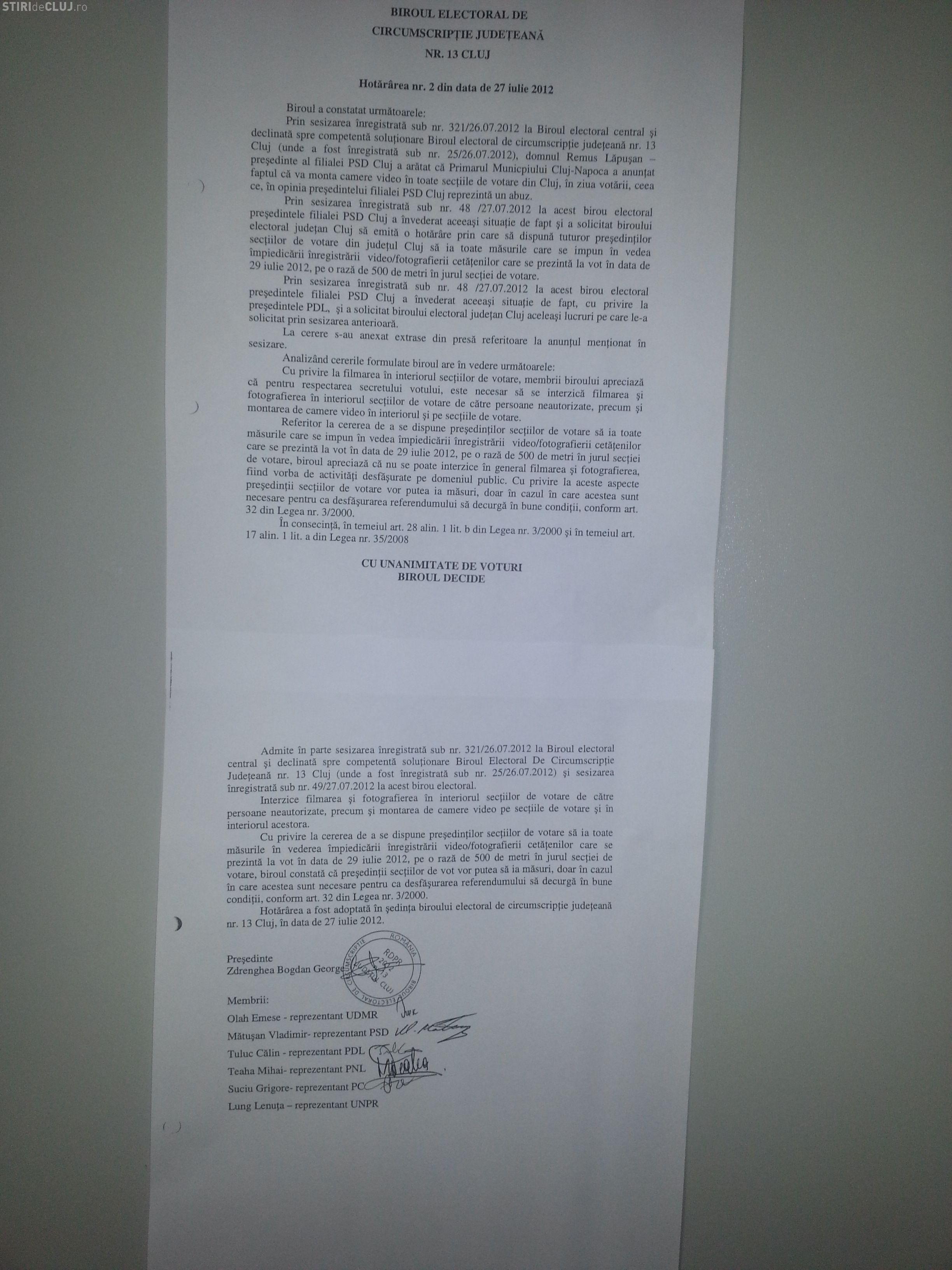 "Preşedintele PDS Cluj a colicitat Biroului Electoral Judeţean Cluj să emită o hotărâre prin care să dispună tuturor preşedinţiilor secţiilor de votare din judeţul Cluj să ia toate măsurile care se impun în vederea împiedicării înregistrării video/fotografierii cetăţenilor care se prezintă la vot în data de 29 iulie, pe o rază de 500 de metri în jurul secţiei de votare", scrie în hotărârea remmisă de BEJ Cluj.