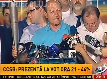”Acest referendum, prim modul în care s-a desfășurat, a arătat că cei care au dat lovitura de stat n-au nici măcar fair-play. Adevăratul referendum, pe care românii l-au validat este acela în care li se cerea parlament unicameral și 300 de parlamentari. Pentru asta urmează să dăm o adevărată bătălie politică. Ei nu pot avea gândirea, pretenția ca doar referendumurile care le convin să poată fi validate. Puscăriabilii trebuie să înțeleagă că referendumurile validate sunt obligatorii pentru că reprezintă suveranitatea exercitată direct de români. Vă mulțumesc încă o dată români că nu ați validat lovitura de stat”, a spus Train Băsescu la finalul votului.