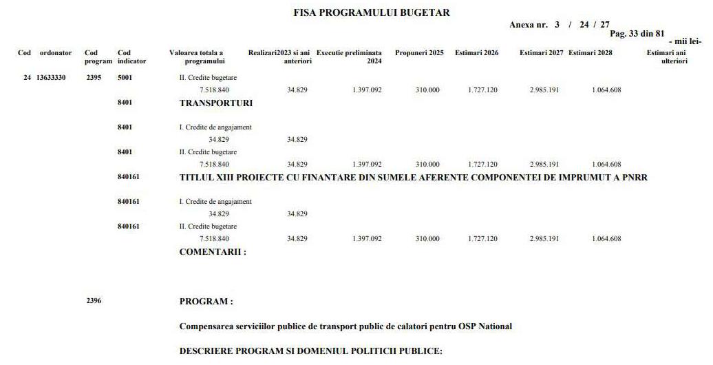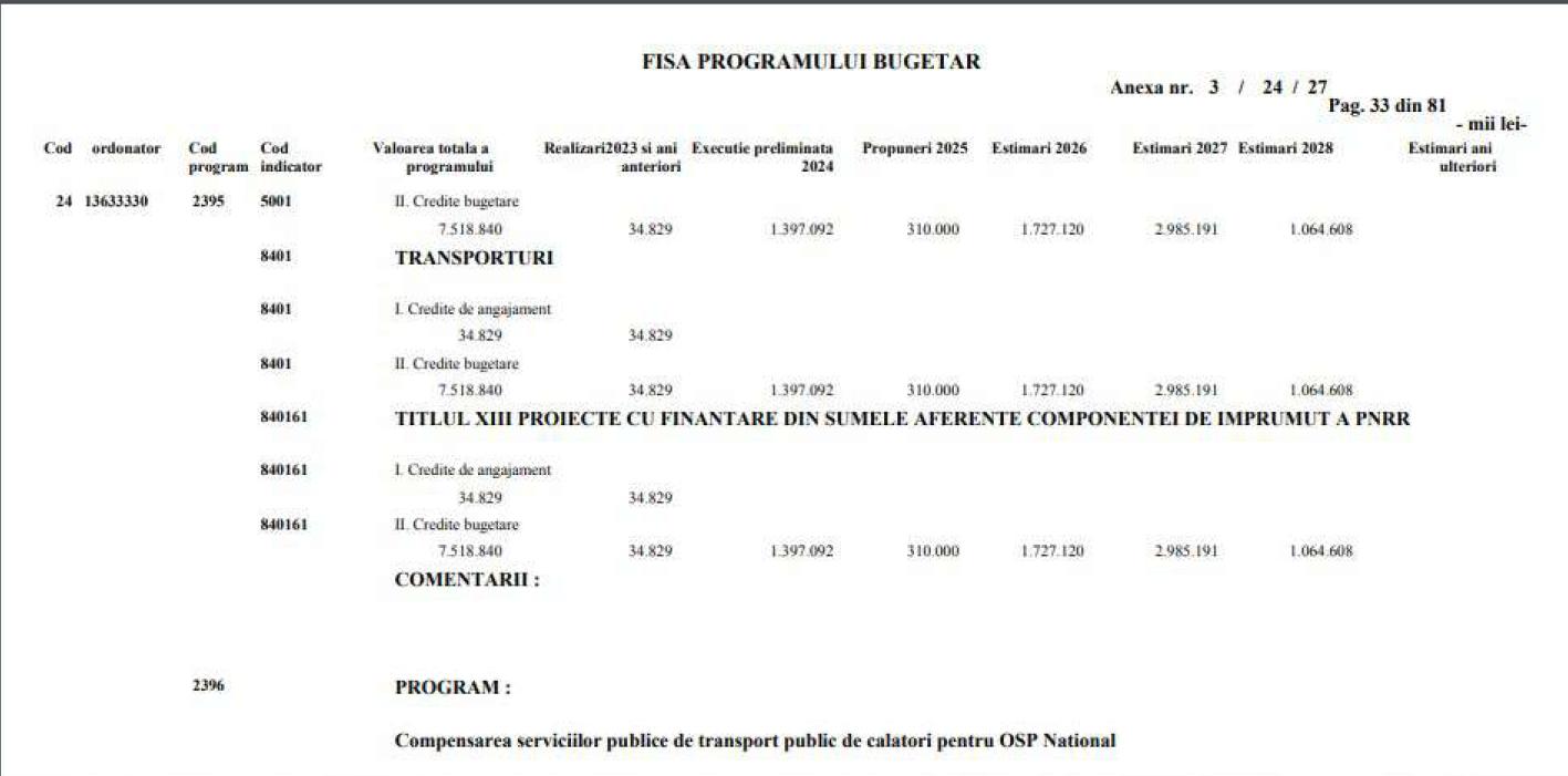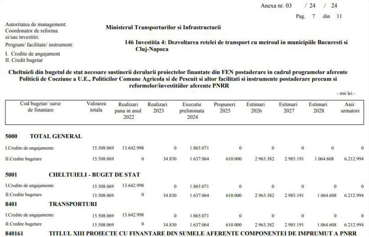 Potrivit Primăriei, alocarea de 310 milioane de lei poate fi verificată în proiectul de buget al Guvernului României pentru anul 2025, în cadrul Ministerului Transporturilor și Infrastructurii, menționată în Anexa nr. 3/24 a documentului oficial, în mai multe secțiuni relevante: