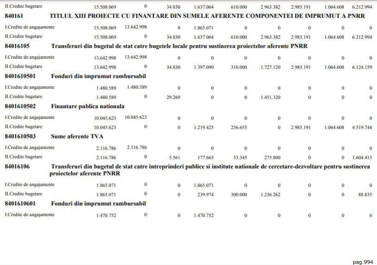 - Pagina 994: În cadrul Programului 146 - Investiția 4: Dezvoltarea rețelei de transport cu metroul în municipiile București și Cluj-Napoca, sunt prevăzute fonduri sub capitolul bugetar 84 - Transporturi, în categoria Titlul XIII - Proiecte cu finanțare din sume aferente componentei de împrumut a PNRR (840161), respectiv codul bugetar 84016105 - care se referă la transferuri din bugetul de stat către bugetele locale pentru susținerea proiectelor PNRR.
