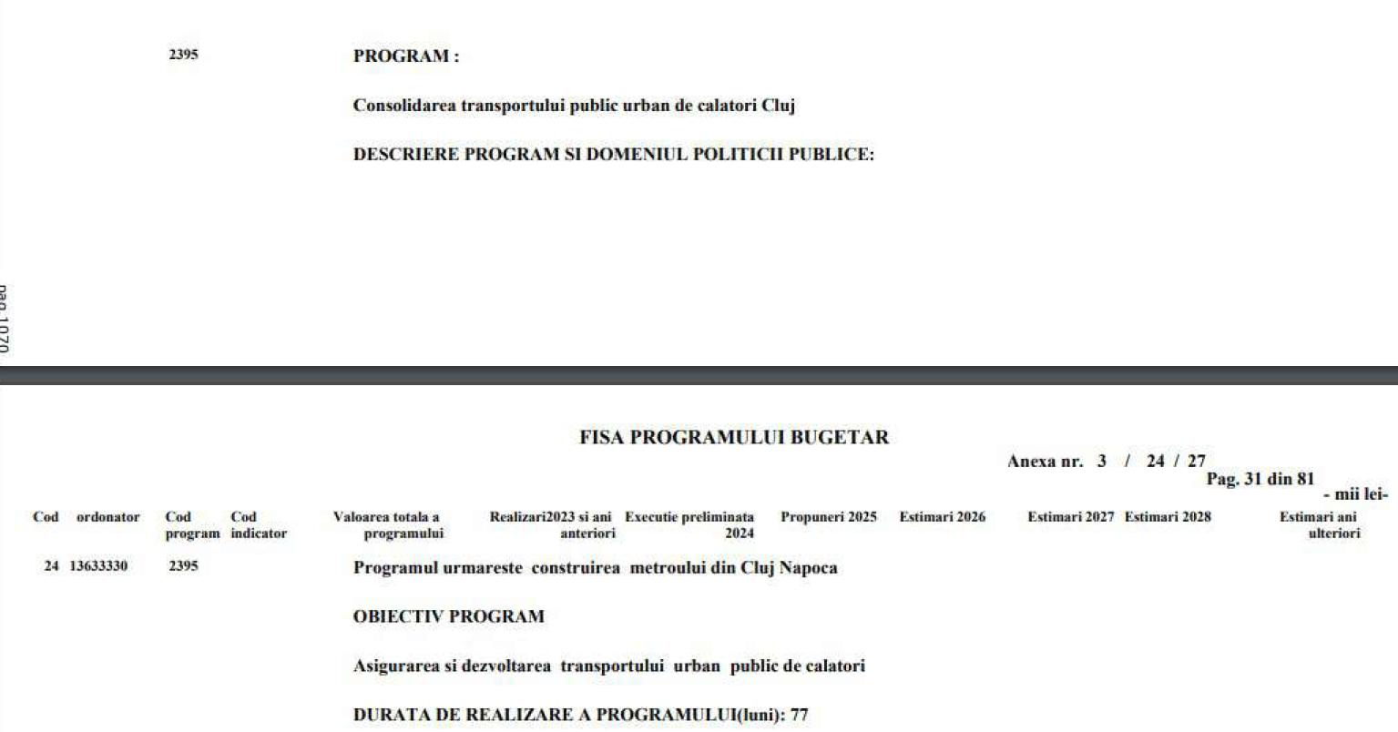 „Precizăm faptul că metroul din Cluj are prinsă finanțare de 310.000.000 lei în bugetul național, care asigură continuarea proiectului de realizare a metroului. Acest fapt poate fi verificat în proiectul de buget al Guvernului României pentru anul 2025 - Ministerul Transportului și infrastructurii Anexa nr.3/24” .