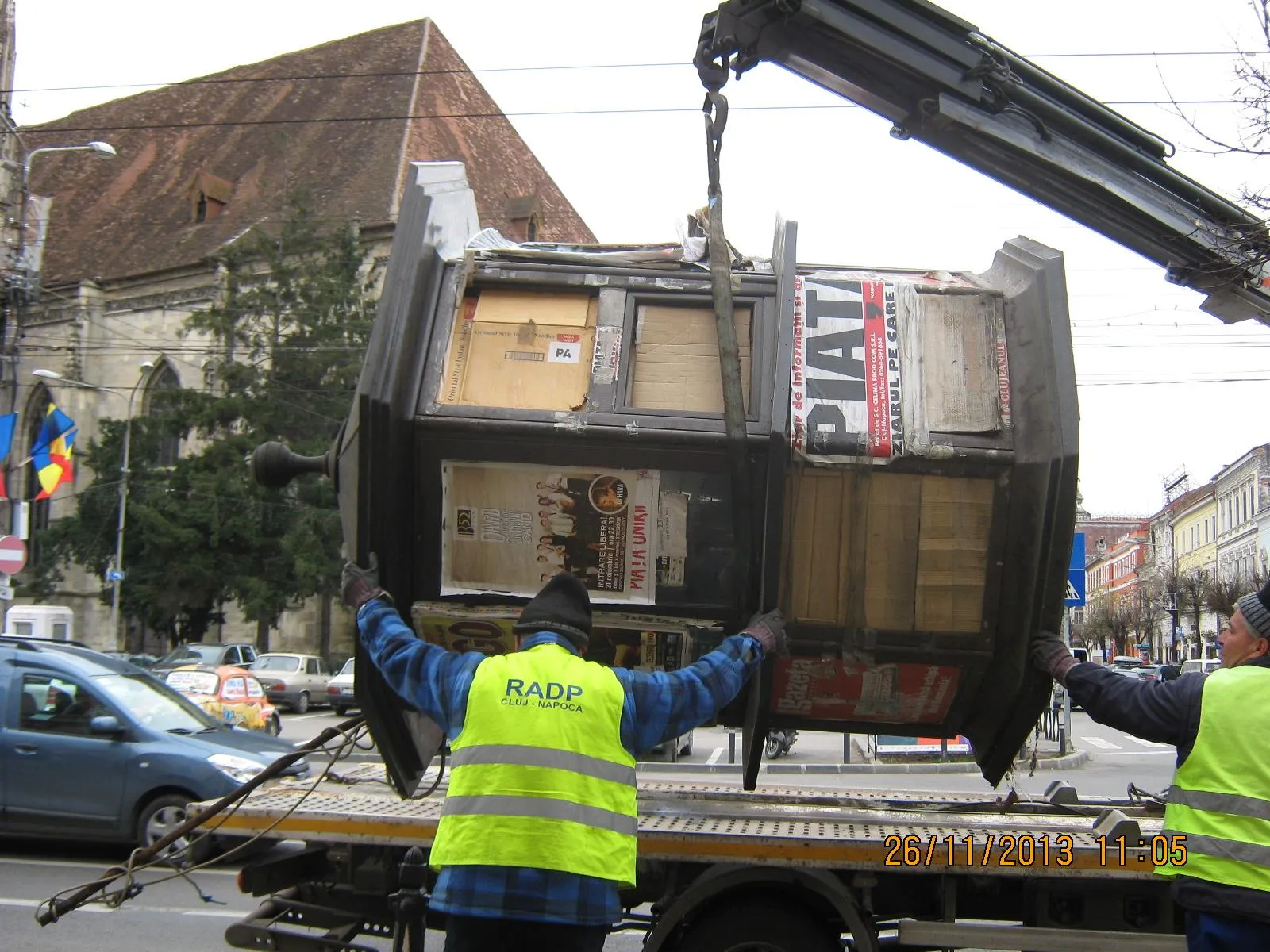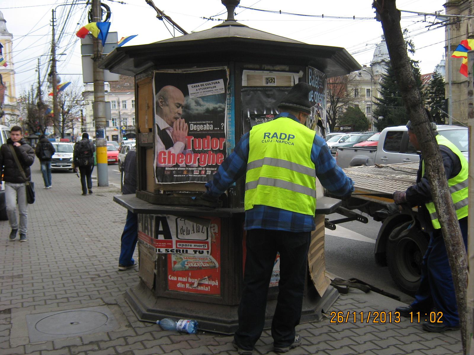 ”În data de 26.11.2013, poliţiştii locali din cadrul Serviciului Inspecţie comercială, cu sprijinul Regiei Autonome a Domeniului Public Cluj-Napoca, au ridicat de pe domeniul public 4 gherete de presă-carte de la care nu se desfăşura activitate comercială de mai mult de 30 de zile consecutive. Gheretele erau degradate, cu geamuri sparte şi nu au fost ridicate de către proprietari în urma somaţiilor transmise în conformitate cu prevederile H.C.L. nr. 170/2009”, precizează reprezentanții municipalității.