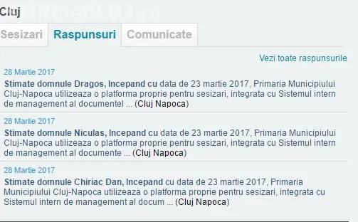 Răspunsurile și sesizările pot fi văzute de oricine numai pe site -ul Primăriei Cluj-Napoca.