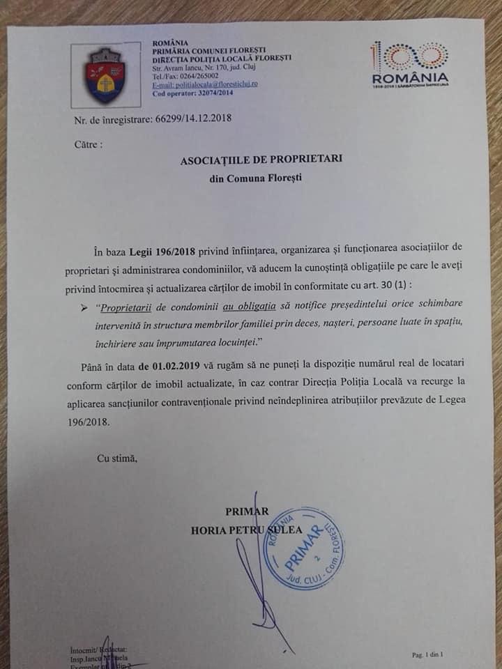 Primarul comunei Florești, Horia Șulea, a anunțat că administratorii blocurilor vor fi amendați dacă nu raportează numărul real de persoane care locuiesc în blocuri.