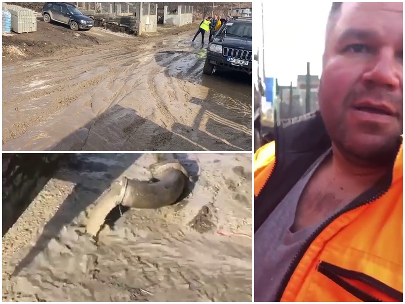 La vizita pe șantier s-a găsit un haos de nedescris. O pompă deversa apa cu beton direct pe drum, fiind o mocirlă peste tot.