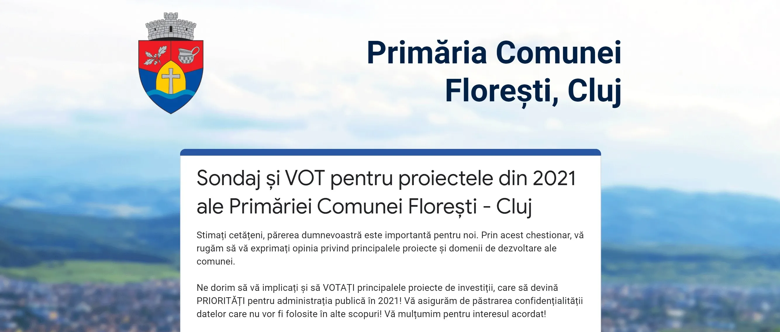 ”Pentru că implicarea civică este cea mai importantă parte în dezvoltarea unei comunități, vă rugăm să vă exprimați opinia privind principalele proiecte și domenii de dezvoltare ale comunei. Ne dorim o colaborare cu voi toți prin Bugetarea Participativă, dar și prin chestionare precum cel din atașament pentru că fiecare își cunoaște cel mai bine zona în care locuiește, iar părerea dumneavoastră este importantă în dezvoltarea Floreștiului”, a transmis primarul Bogdan Pivariu.