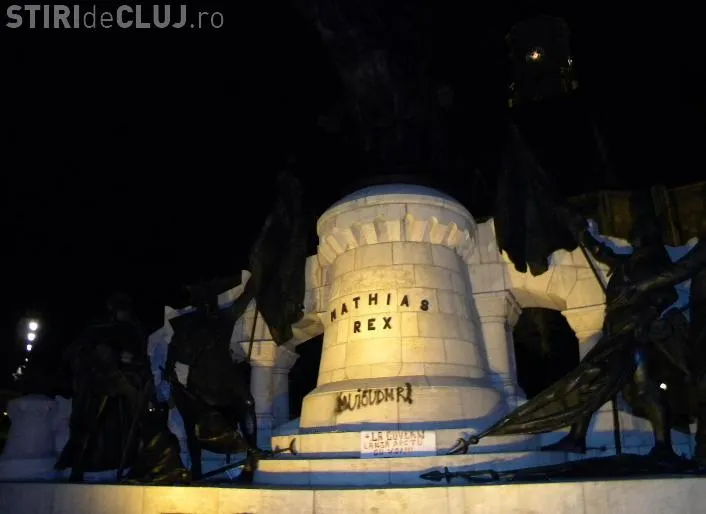 Patru suporteri ai Universitatii Cluj au scris cu un spray "M..e UDMR" pe statuia lui Matei Corvin.