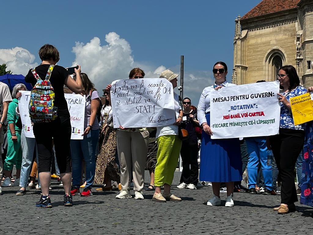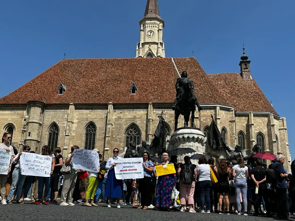 Protestul cadrelor din învățământ clujene a continuat astăzi printr-o adunare în Piața Unirii. Profesori, învățători și educatori din tot județul au participat la o pichetare, organizată de sindicaliștii din învățământ.