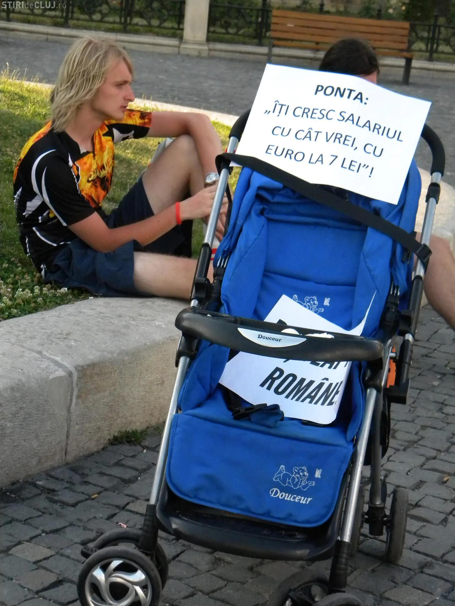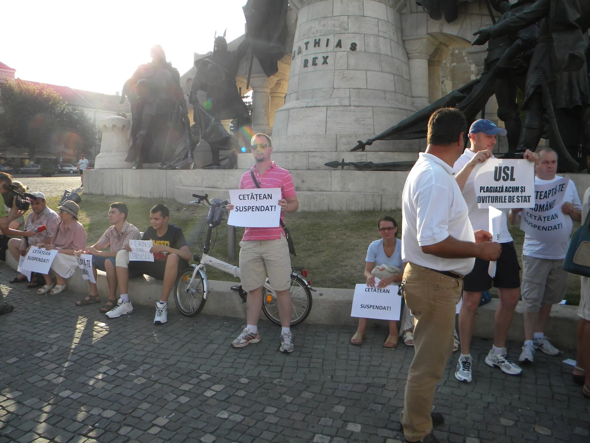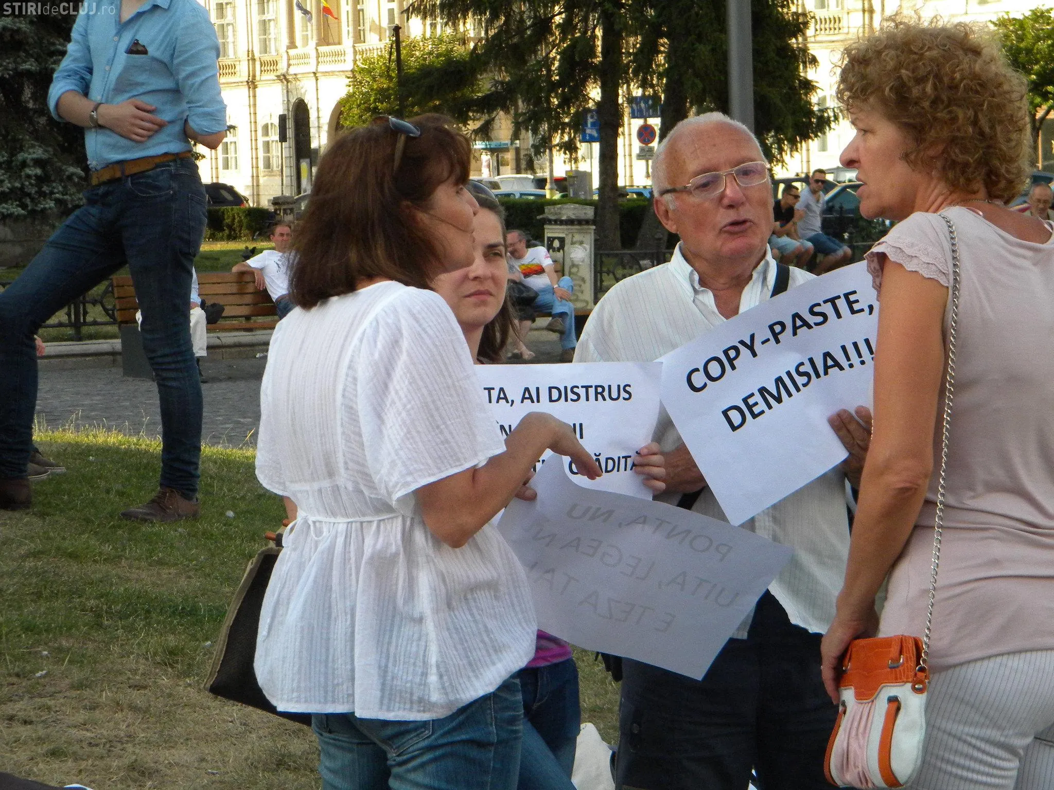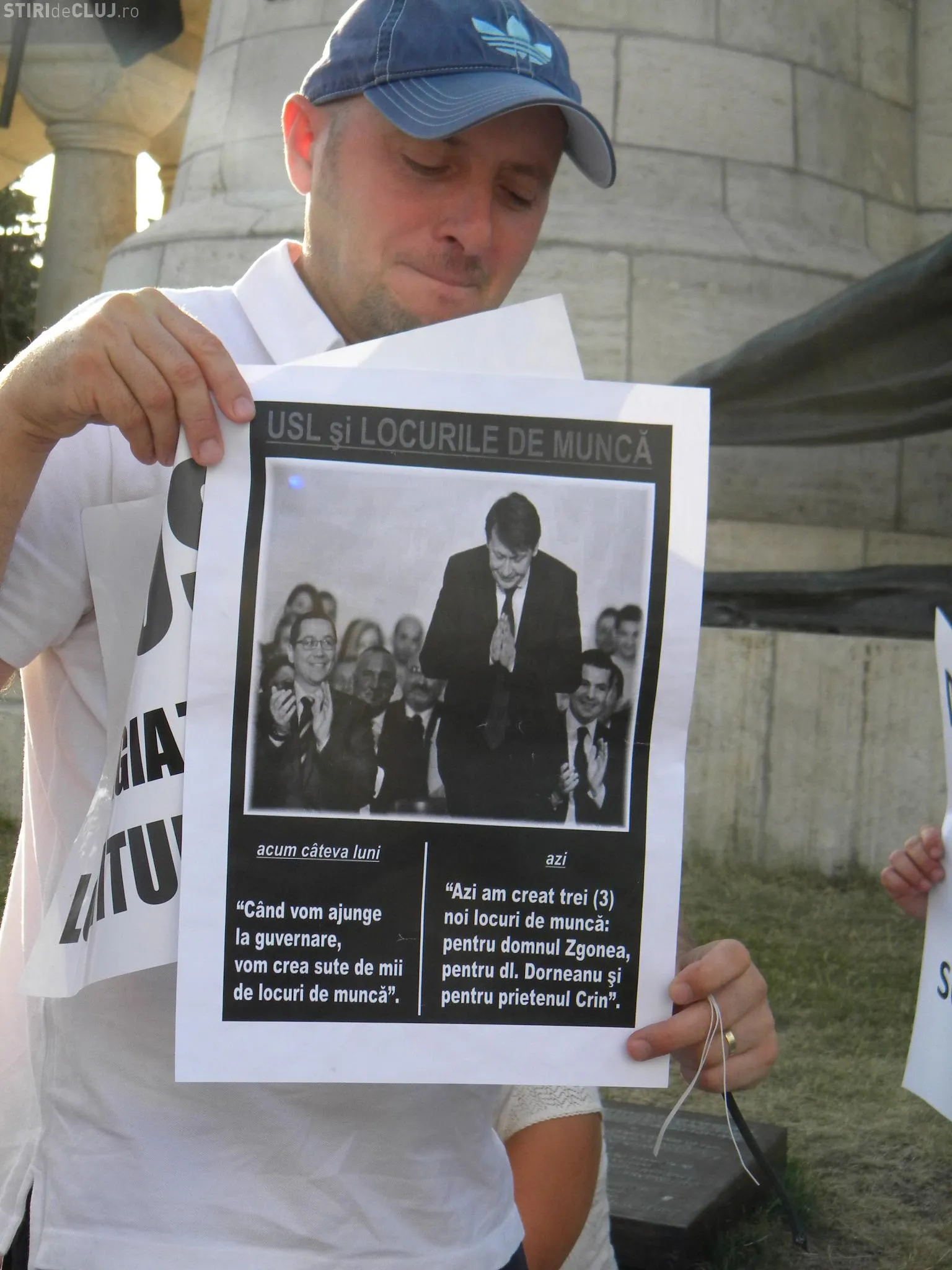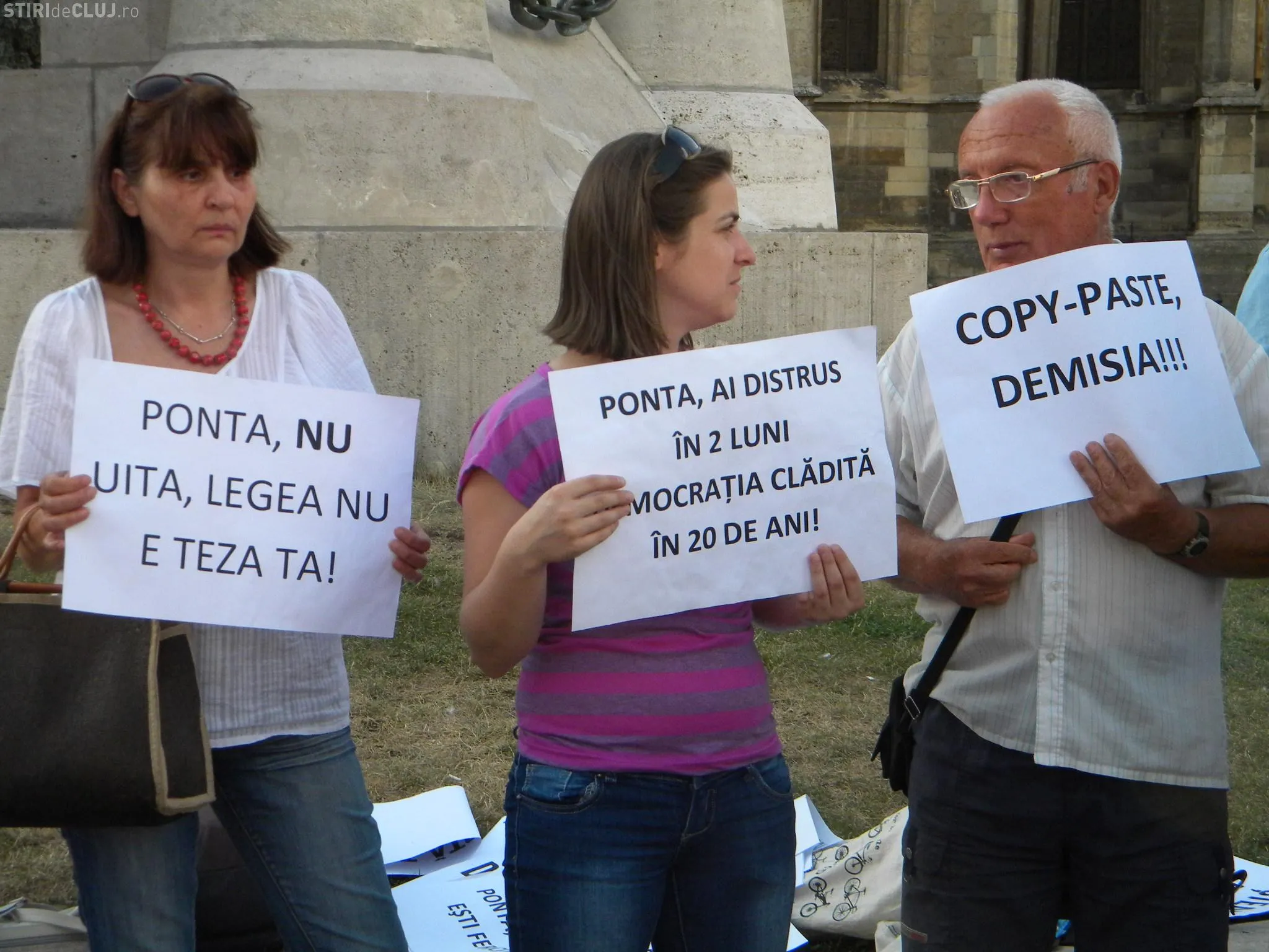 În total, s-au strâns în jur de 50 de clujeni care au purtat pancarte expresive: ”Ponta ai distrus în două luni democrația clădită în 20 de ani”, ”Cetățean suspendat”, Copy-Pase, demisia!”, ”Deșteaptă-te române”, ”Ponta: Îți cresc salariul cu cât vrei, cu Euro la 7 lei”, ultima fiind pusă pe un carucior de copil.