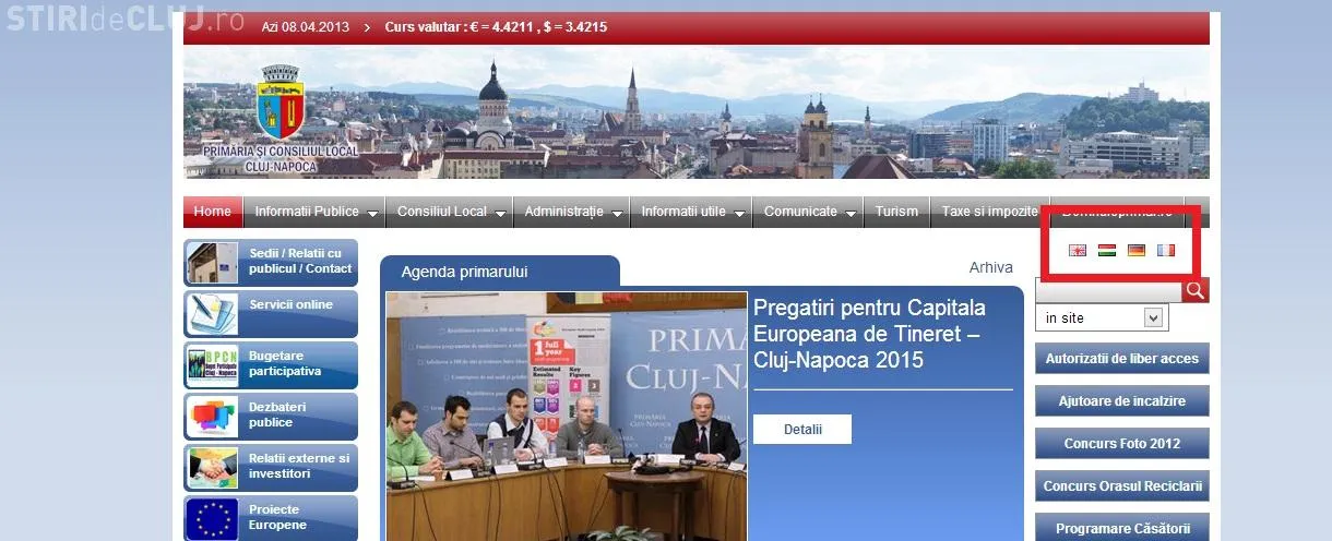 Pe site -ul www.primăriacluj-napoca.ro apar butoanele de traducere în patru limbi străine: engleză, maghiară, germană și franceză, dar acestea nu funcționează.