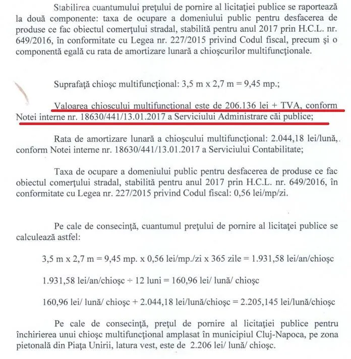 ”Valoarea reală a chioşcului, care este achitată câştigătorului licitaţiei pentru obiectivul de investiţii „Modernizare Piaţa Unirii etapa 2” este de 29.026 euro+TVA. Diferenţa de 11.450 euro reprezenta realizarea standului de ziare la care Primăria Cluj-Napoca a renunţat. Astfel, Primăria decontează pentru un chioşc 29.026 euro +TVA.