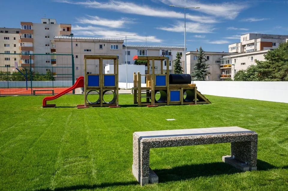 Primăria municipiului Cluj-Napoca anunță că primul parking semi-îngropat din România care dispune de terasă verde, teren de sport și spațiu de joacă a fost finalizat în cartierul Mănăștur.
