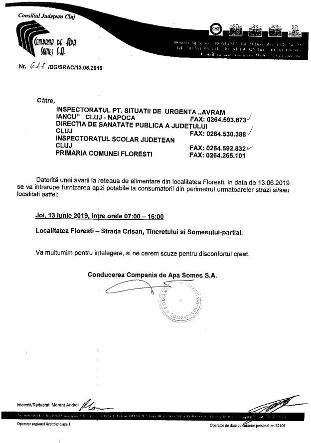 ”Compania de Apă Someș SA ne-a anunțat azi că, datorită unei avarii la rețeaua de alimentare din localitatea Florești, în data de 13.06.2019, se va întrerupe furnizarea apei potabile la consumatorii din perimetrul următoarelor străzi: