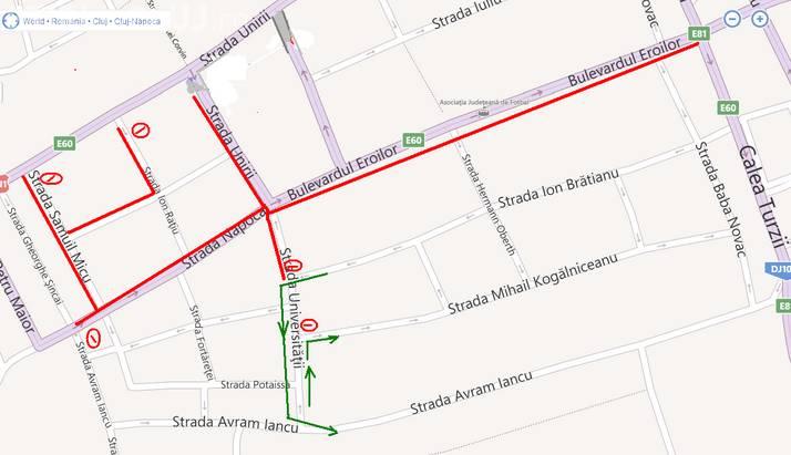 Din data de 4 august începând cu ora 15.00, în cadrul acţiunii de realizare a zonei pietonale în centrul municipiului, se va închide circulaţia auto pe strada Napoca, Eroilor, Piaţa Unirii -. Laturile estică şi sudică, str. I.Raţiu, Samuil Micu, str. Universităţii tronsonul cuprins între Piaţa Unirii şi str. I.C. Brătianu. Pe str.Universităţii între str.Avram Iancu şi str.M.Kogalniceanu se va permite circulaţia dublu sens începând cu ora 15.00.