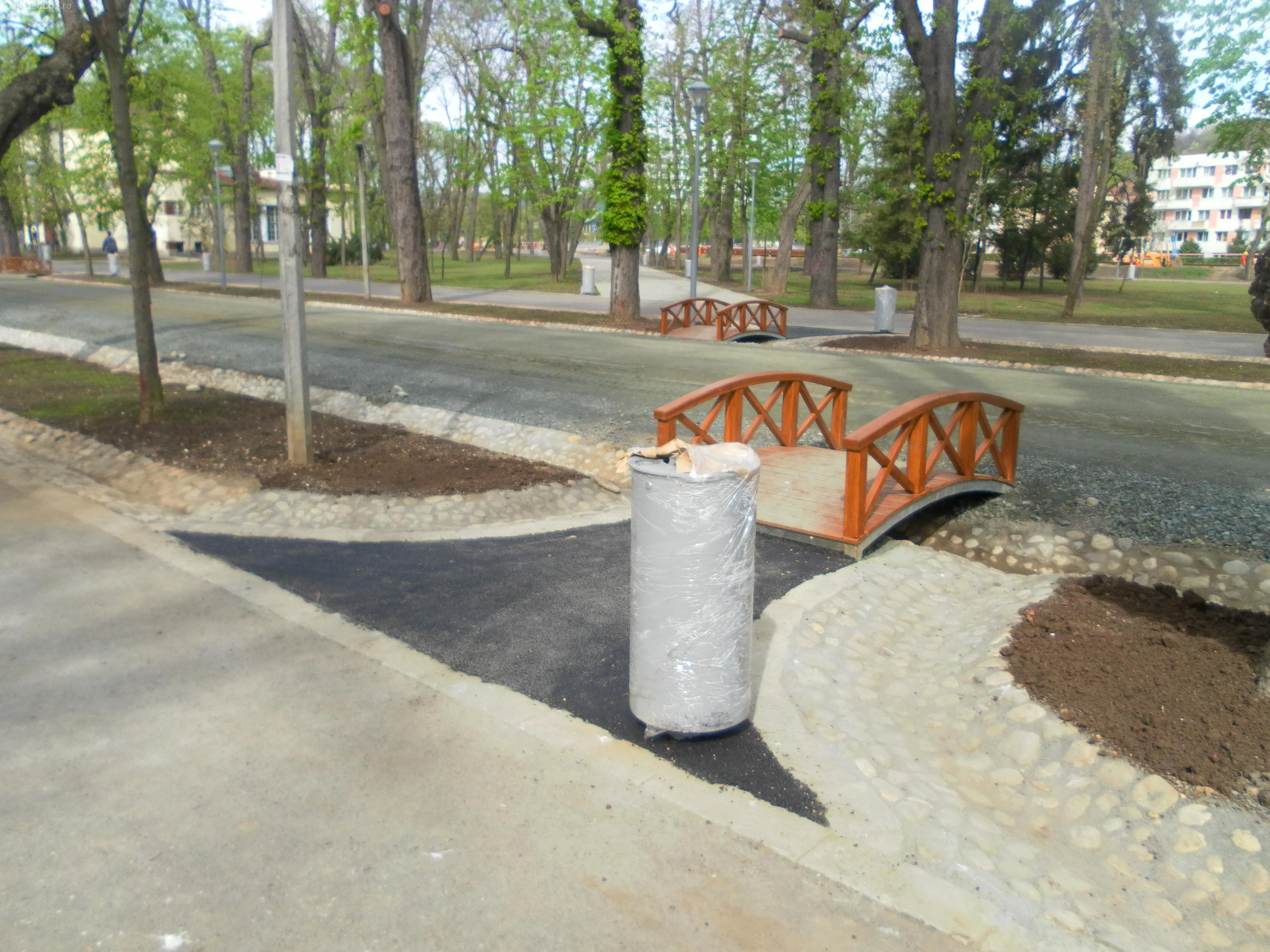 Lucrarile din Parcul Central se aproprie de sfarsit. Muncitorii au montat deja o parte din banci, podete si au pus ruloruri de gazon in mai multe parti, dar si in jurul lacului Chios.