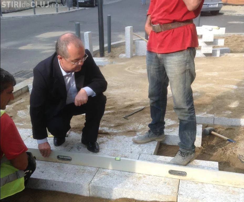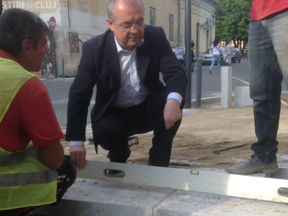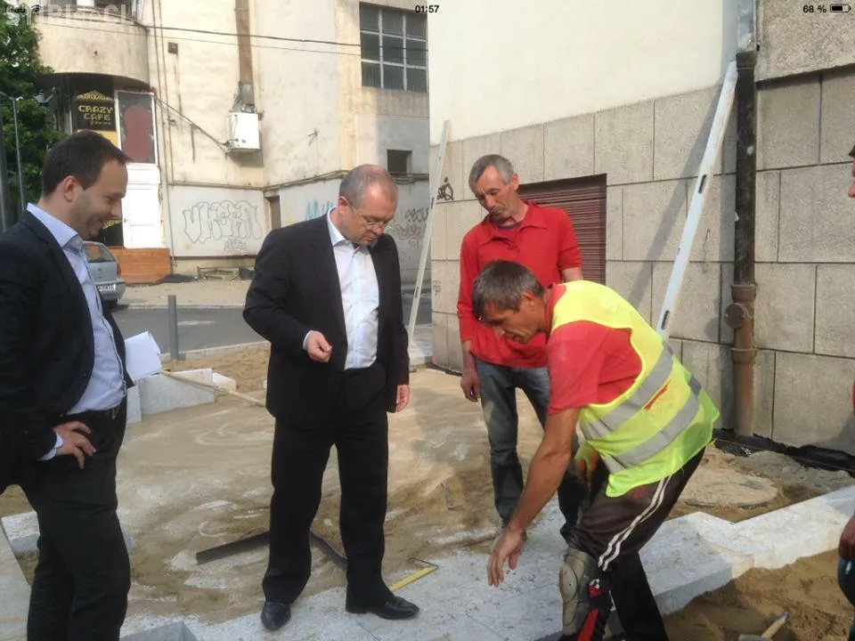 Primarul Emil Boc a stat de vorbă cu muncitorii de pe strada Brătianu, unde se montează pavajul cu 6 luni întârziere.