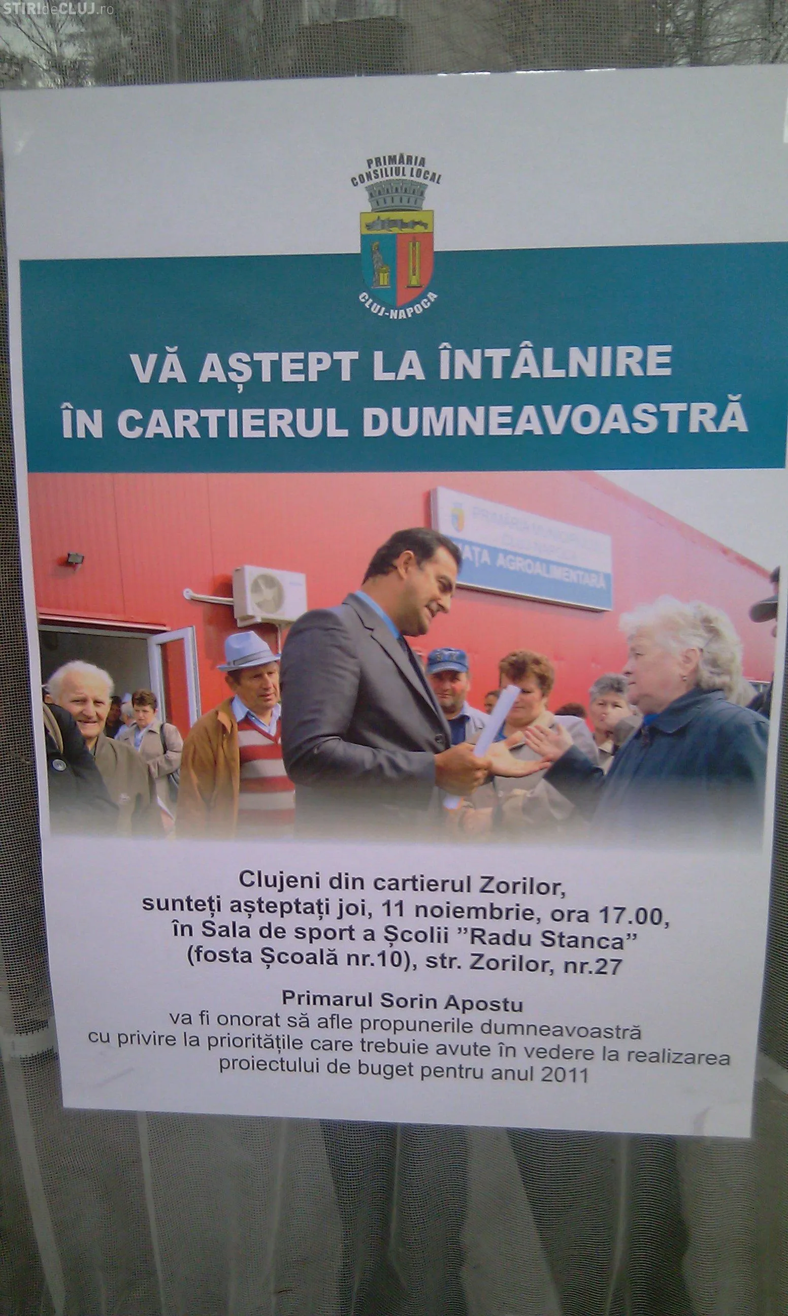 Primarul Sorin Apostu a impanzit cartierele Manastur si Zorilor cu afise prin care ii cheama pe clujeni la discutii, pentru a le afla necazurile. Afisele sunt xeroxate in primarie, pe bani publici!