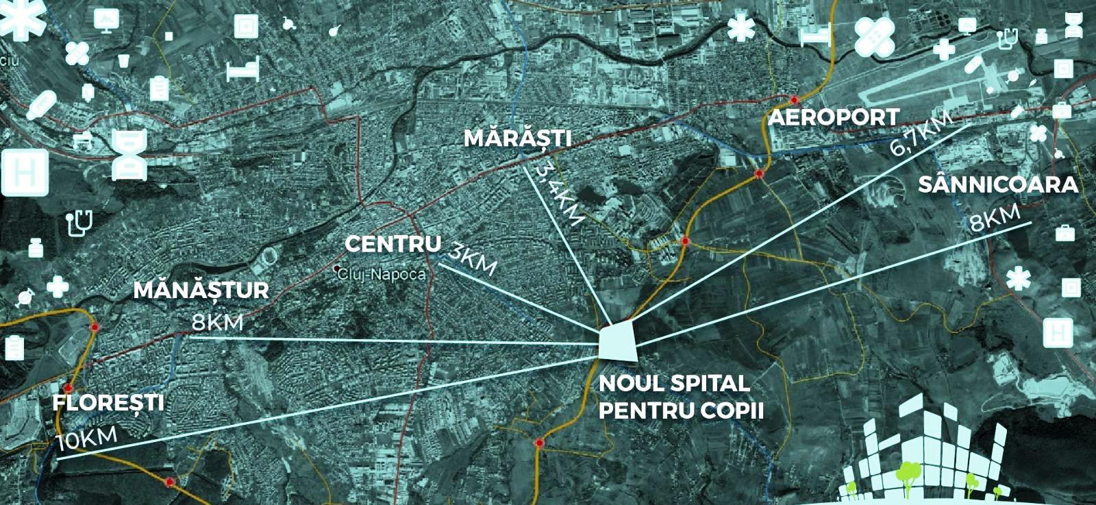 Spitalul pediatric monobloc din Cluj va fi construit pe un teren de 16 hectare situat în zona Becaș. În luna septembrie a anului trecut, președintele Consiliului Județean Cluj, Alin Tișe, și rectorul Universității de Științe Agricole și Medicină Veterinară din Cluj, Cornel Cătoi, au semnat protocolul de predare-primire a terenului din Borhanci pe care se va construi spitalul. Terenul a intrat în posesia Consiliului Județean de la USAMV printr-o lege adoptată în procedură de urgență de către Parlamentul României.