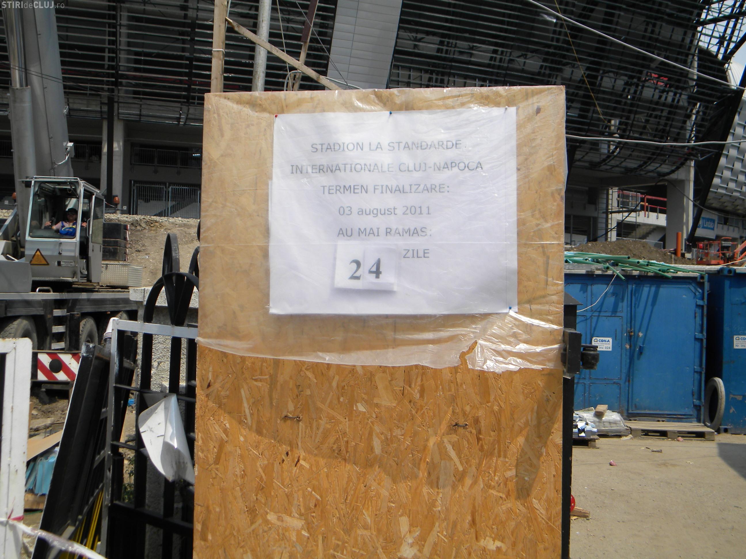 Conducerea Consiliului Judetean Cluj a postat la intrare in statdionul Cluj Arena o placa pe care scrie ca lucrarea trebuie terminata pana in 3 august si "AMR -ul" este de 24 de zile.
